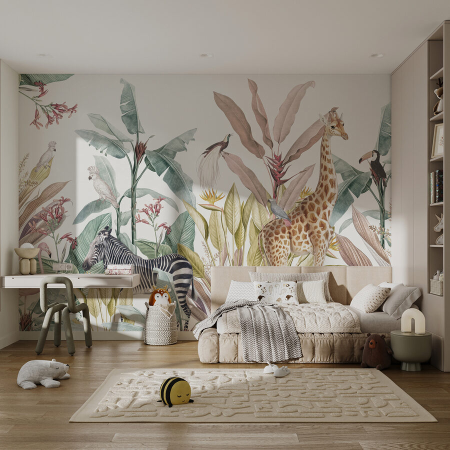 Potrebujete sa rýchlo dostať do savany? Fototapeta “Žirafa s vtákom na chrbte” je presne to, čo potrebujete. Táto detská fototapeta hýri farbami a priateľskými zvieratkami zo safari, ktoré sú ideálne na rozprúdenie detskej predstavivosti. Je tu nepredvídateľná žirafa, ktorá stojí vysoko a na chrbte jej sedí malý vtáčik – rozkošný kamarát s prekvapením! Zebra ležérne chrumká listy a papagáj pokukuje, čím dodáva farebný nádych s drzým humorom. Je to ako hravá rozprávková kniha priamo na vašej stene a premení každú miestnosť na mini dobrodružstvo. Vezmite si jeden a nechajte svoje dieťa rozvíjať fantáziu!