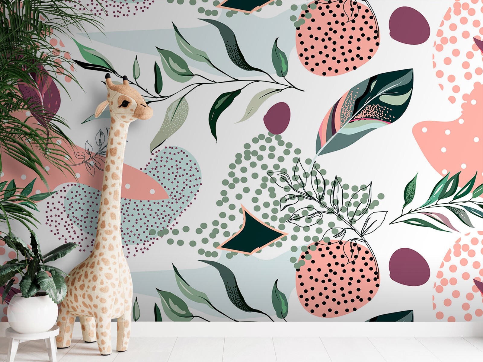 Už ste niekedy videli nástennú maľbu a mali ste pocit, že do miestnosti prináša závan čerstvého vzduchu? Presne to robí tento vzor Abstract Leaves and Dots. Je to hravý tanec listov a rozmarných bodiek, ktorý je ideálny na to, aby v detskej izbe vyvolal trochu radosti. Predstavte si, že sa vaša dcéra zobudí na tento veselý rad pastelových tvarov, ktorý jej okamžite rozjasní ráno. Alebo váš syn môže snívať o dobrodružstvách medzi abstraktnými listami.