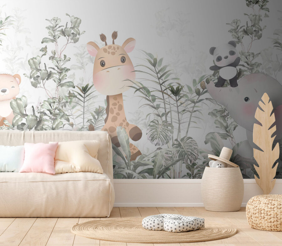 Premeňte detský priestor na rozmarné dobrodružstvo v džungli s touto rozkošnou fototapetou s pôvabnou žirafou, hravou pandou a malým sladkým medvedíkom. Predstavte si, že vojdete do miestnosti a okamžite pocítite teplo živého, prírodného sveta – kde kvitne kreativita a vznášajú sa sny. Jemné farby a očarujúce zvieratká podnecujú predstavivosť, vďaka čomu sa čas rozprávania stane ešte čarovnejším zážitkom. Je ideálny na vyvolanie chichotu a príjemných pocitov, je to ako mať malý kúsok divočiny priamo na stenách. Kto by sa nechcel prebúdzať obklopený touto farebnou posádkou? Džungľa nie je len pre zvieratá – je aj pre najmenších!