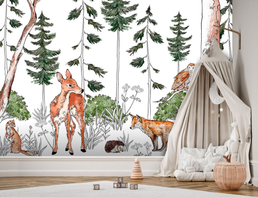 Premeňte akýkoľvek priestor s touto očarujúcou nástennou maľbou, na ktorej je zobrazená rozkošná skupina lesných zvierat! Predstavte si pokojnú lesnú scenériu, kde medzi bujnou zeleňou pobehuje zvedavý jeleň a hravá líška. Sova pozoruje zhora a dodáva scéne nádech fantázie. Je to ako mať kúsok prírody priamo na stene. Táto fototapeta je ideálna do útulného kútika na čítanie alebo do detskej izby, kde prináša kúsok prírody dovnútra a každý pohľad sa stáva malým dobrodružstvom. Rozširujte radosť a teplo a nechajte rozprávať príbehy vo vašom vlastnom čarovnom lese – s týmito chlpáčmi sa nikdy nebudete nudiť!