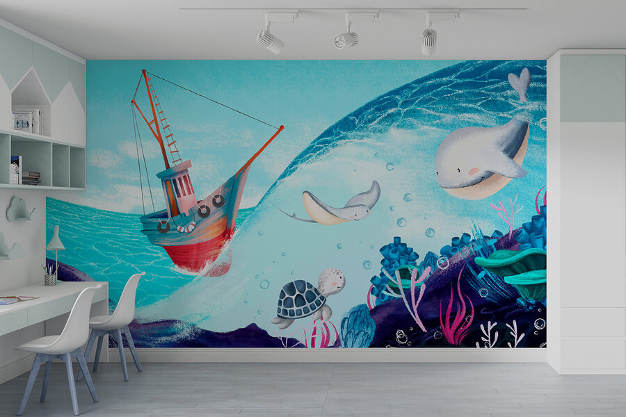 Ponorte sa do sveta zábavy s touto očarujúcou nástennou maľbou s priateľskými veľrybami plávajúcimi v živej podmorskej scéne. Je ideálna do detskej izby a je ako otvorený portál do oceánu, kde sa fantázia môže rozvíjať. Predstavte si to: deti sa pozerajú na pestrofarebné rybky a hravé korytnačky, oči im žiaria úžasom, pretože každý deň skúmajú tento čarovný morský život. Jemné odtiene prinášajú pocit pokoja, vďaka čomu sa stane útulným útočiskom pre malé deti po dlhom dni plnom hier. Táto fototapeta dodáva nádych rozmarnosti, ktorý premení každú stenu na dobrodružstvo!