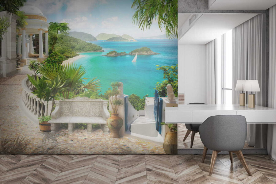 Predstavte si to: vojdete do svojej izby a okamžite sa prenesiete do pokojného prímorského raja. Presne to dokáže nástenná maľba “Rastlina v kvetináči”. Je to, akoby ste mali priamo na stene minivíkendové miesto. Tie svieže zelené rastliny, pokojný biely pavilón a úchvatná tyrkysová voda – to je dokonalý pokoj!