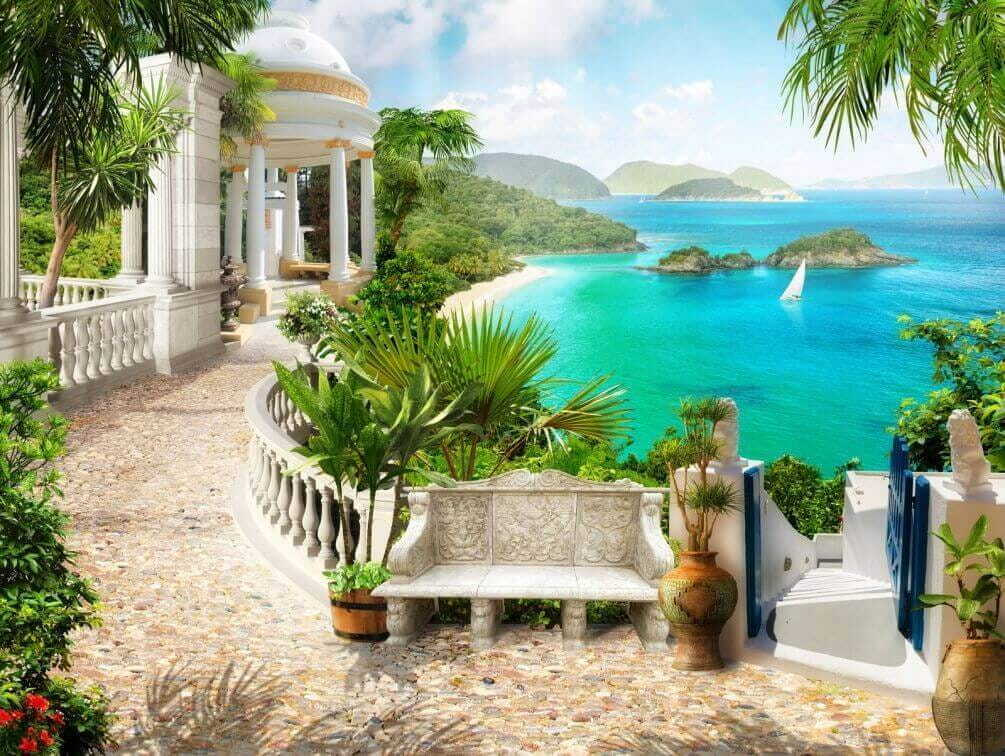 Predstavte si to: vojdete do svojej izby a okamžite sa prenesiete do pokojného prímorského raja. Presne to dokáže nástenná maľba “Rastlina v kvetináči”. Je to, akoby ste mali priamo na stene minivíkendové miesto. Tie svieže zelené rastliny, pokojný biely pavilón a úchvatná tyrkysová voda – to je dokonalý pokoj!