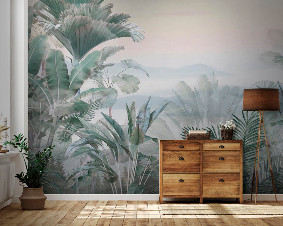Predstavte si, že zakaždým, keď vojdete do svojej izby, vstúpite do hmlistej džungle! Táto nástenná maľba “Tropické rastliny v hmlistej džungli” je ako dažďový prales priamo u vás doma – bez hmyzu. Jemná, hmlistá atmosféra džungle so sviežou zeleňou a jemnou hmlou vytvára pocit pokojného útočiska. Predstavte si, že sa zobudíte s týmto výhľadom – jemný únik, pokojný začiatok dňa.