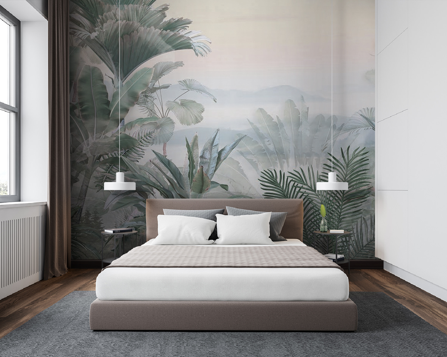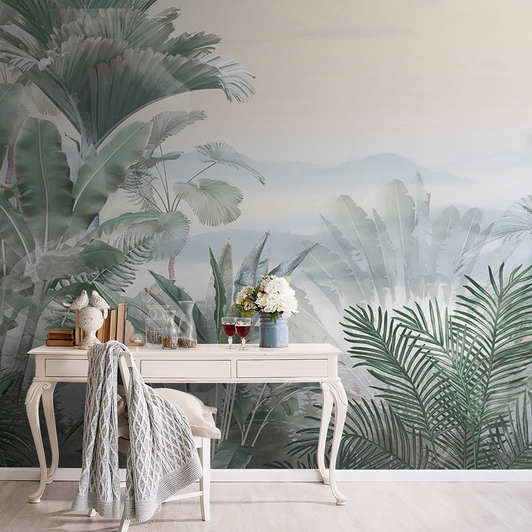 Predstavte si, že zakaždým, keď vojdete do svojej izby, vstúpite do hmlistej džungle! Táto nástenná maľba “Tropické rastliny v hmlistej džungli” je ako dažďový prales priamo u vás doma – bez hmyzu. Jemná, hmlistá atmosféra džungle so sviežou zeleňou a jemnou hmlou vytvára pocit pokojného útočiska. Predstavte si, že sa zobudíte s týmto výhľadom – jemný únik, pokojný začiatok dňa.