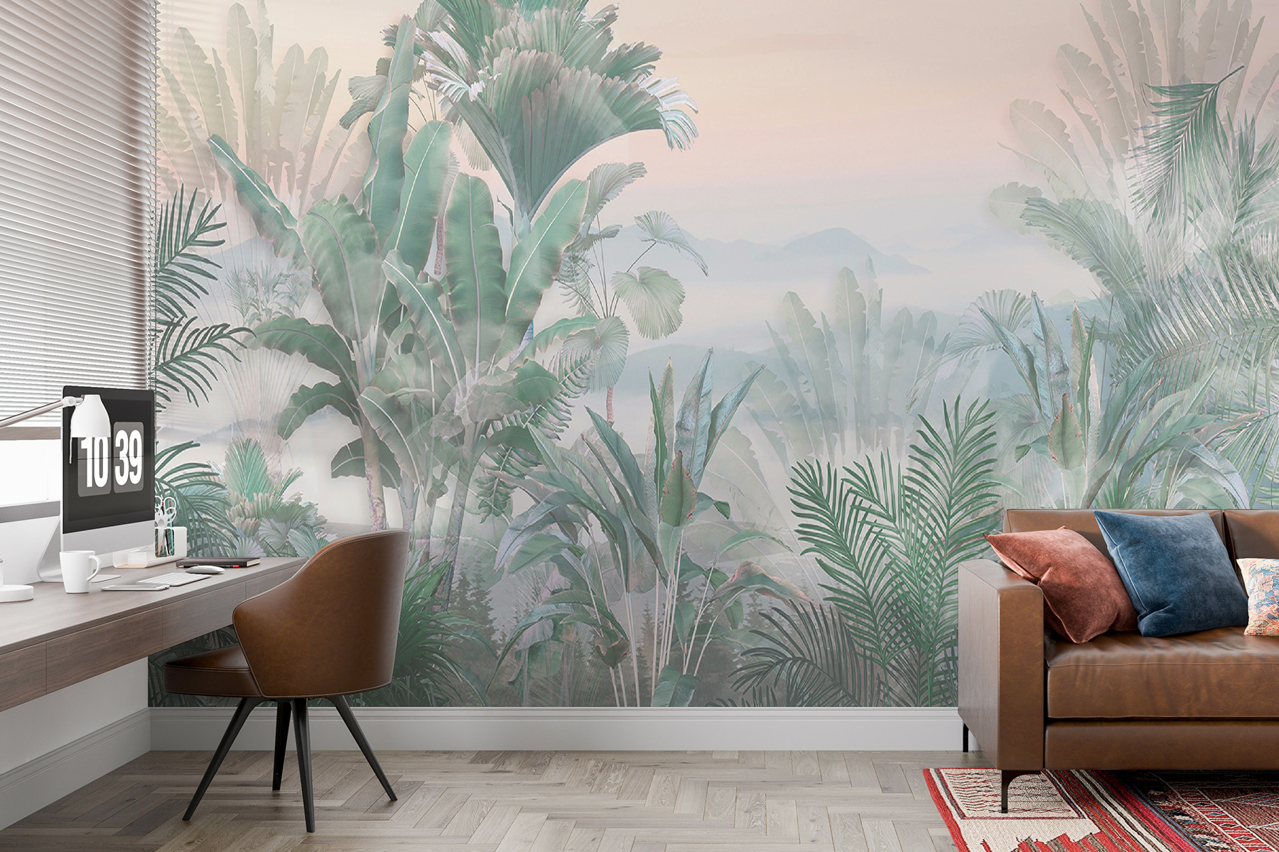 Jednou zo zábavných vecí je, ako sa palmové listy jednoducho prelínajú do tejto zasnenej hmly. Má tú dokonalú rovnováhu, ktorá je výrazná a zároveň upokojujúca. A ak máte zelený palec alebo len milujete rastliny, ale neviete ich udržať pri živote – žiadny strach! Táto nástenná maľba vyvoláva svieži tropický pocit bez jedinej kvapky vody. Skvele sa hodí na to, aby ste sa stratili vo svojich myšlienkach a vniesli trochu zenu do každodenného zhonu.