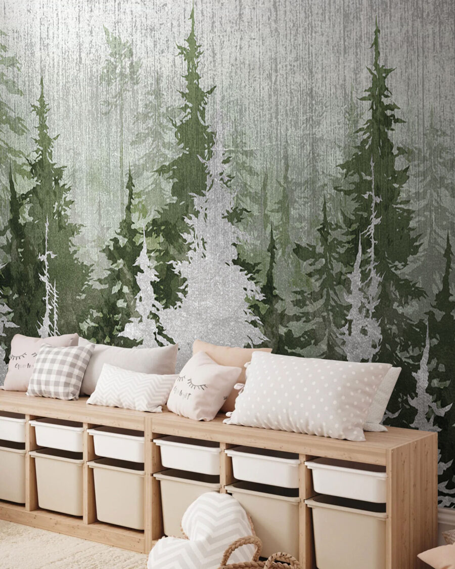 Premeňte svoj priestor pomocou tejto očarujúcej nástennej maľby lesa, v ktorom stromy akoby šepkali tajomstvá vánku. Je to ako vstúpiť do pokojnej lesnej krajiny bez toho, aby ste museli opustiť svoju obývačku. Predstavte si útulné večery strávené popíjaním čaju pri pohľade na pokojnú zeleň a jemnú šeď. Vrstvy stromov vytvárajú hĺbku, takmer ako snový únik z každodenného života. Je ideálny pre každého, kto chce pozvať krásu prírody do svojho domova. Táto nástenná maľba nezdobí len stenu, ale vdýchne život každej miestnosti. Možno sa dokonca pristihnete pri tom, ako sa okolo vás preháňa veverička!