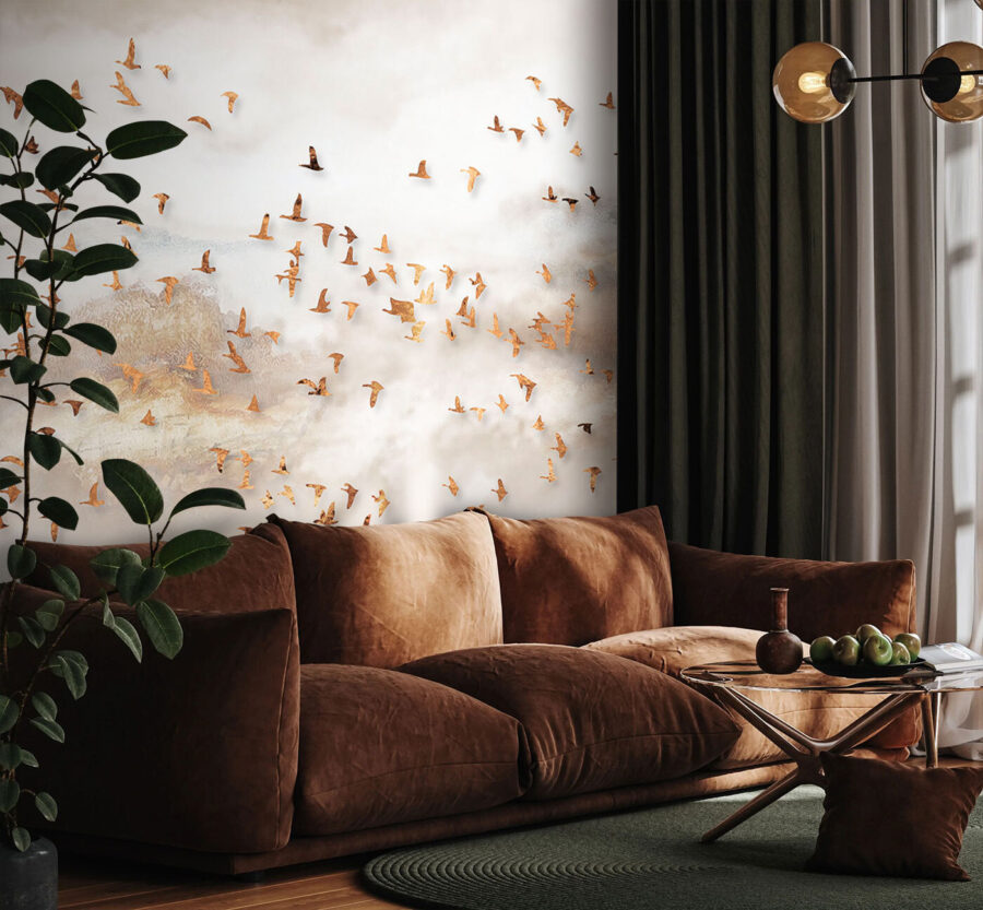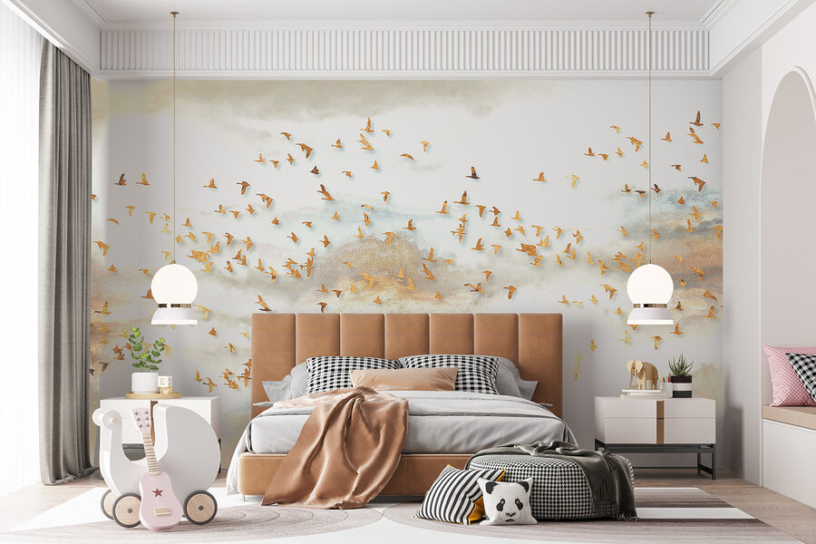Premeňte akúkoľvek miestnosť na pokojný únik s touto úžasnou nástennou maľbou skupiny vtákov letiacich po zasnenej oblohe. Jemné farby a pôvabné vtáky vytvárajú atmosféru, ktorá pôsobí pokojne a povznášajúco, ako svieži vánok počas jarného dňa. Predstavte si, ako pri pohľade na túto podmanivú scénu popíjate rannú kávu alebo sa lúčite po dlhom dni. Vtiahne vás do deja a vyvolá vo vás sny a príbehy. Navyše dodá elegantný nádych každému priestoru, či už je to útulná obývacia izba alebo pokojná spálňa. Kto by sa nechcel cítiť, akoby sa vznášal v oblakoch?