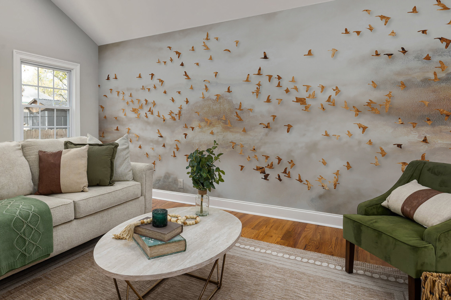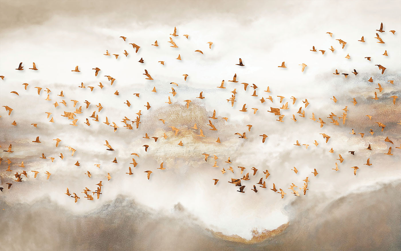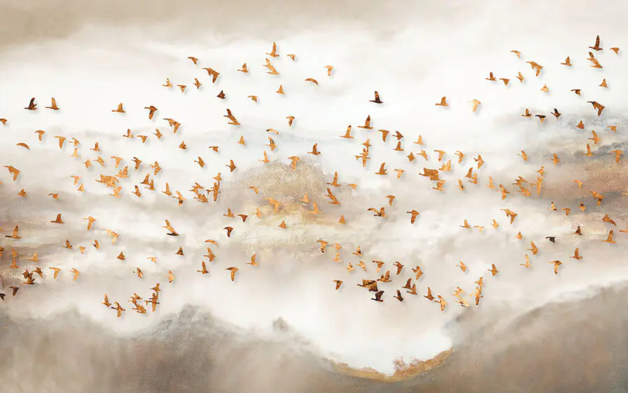 Premeňte akúkoľvek miestnosť na pokojný únik s touto úžasnou nástennou maľbou skupiny vtákov letiacich po zasnenej oblohe. Jemné farby a pôvabné vtáky vytvárajú atmosféru, ktorá pôsobí pokojne a povznášajúco, ako svieži vánok počas jarného dňa. Predstavte si, ako pri pohľade na túto podmanivú scénu popíjate rannú kávu alebo sa lúčite po dlhom dni. Vtiahne vás do deja a vyvolá vo vás sny a príbehy. Navyše dodá elegantný nádych každému priestoru, či už je to útulná obývacia izba alebo pokojná spálňa. Kto by sa nechcel cítiť, akoby sa vznášal v oblakoch?