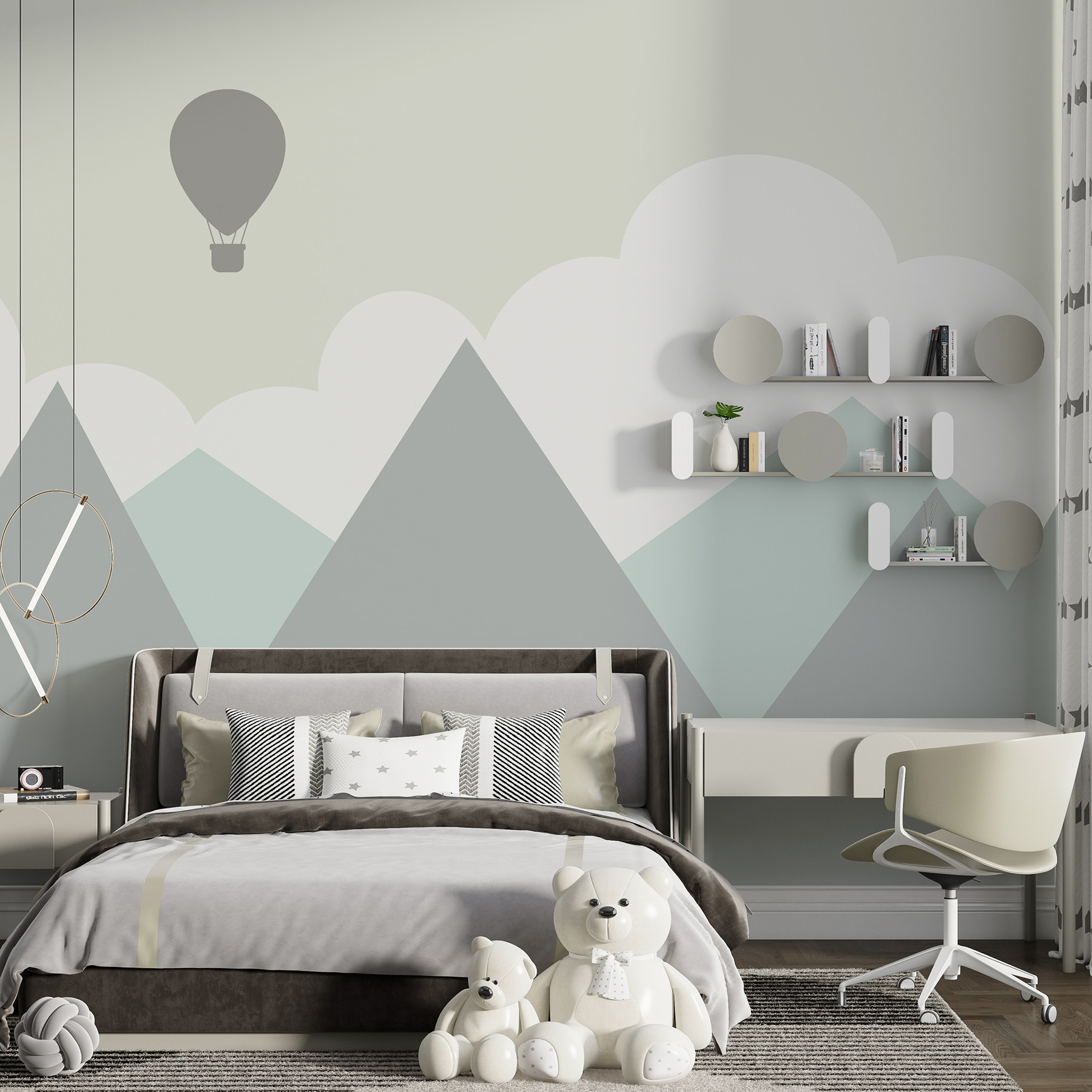 Predstavte si to na stene svojho dieťaťa: zasnený teplovzdušný balón, ktorý sa ticho vznáša nad mäkkými, tlmenými horami. Freska “Tieň teplovzdušného balóna” vyvoláva jemný pocit dobrodružstva a rozmarnosti, ako popoludňajšia obloha namaľovaná fantáziou. Táto nástenná maľba, ktorá je ideálna do detských izieb alebo detských izieb, zahalí každého do útulnej, pokojnej krajiny – ideálnej na rozprávky pred spaním aj na denné snívanie. Je to trochu ako preniesť sa do prírody, ale bez chrobákov (alebo nepredvídateľného počasia). Pomyslite na tie tiché chvíle, keď takmer počujete jemné šumenie balóna na pozadí nekonečných možností. Táto nástenná maľba, ktorá je sladkou zmesou hravosti a pokoja, sa určite stane obľúbeným miestom.