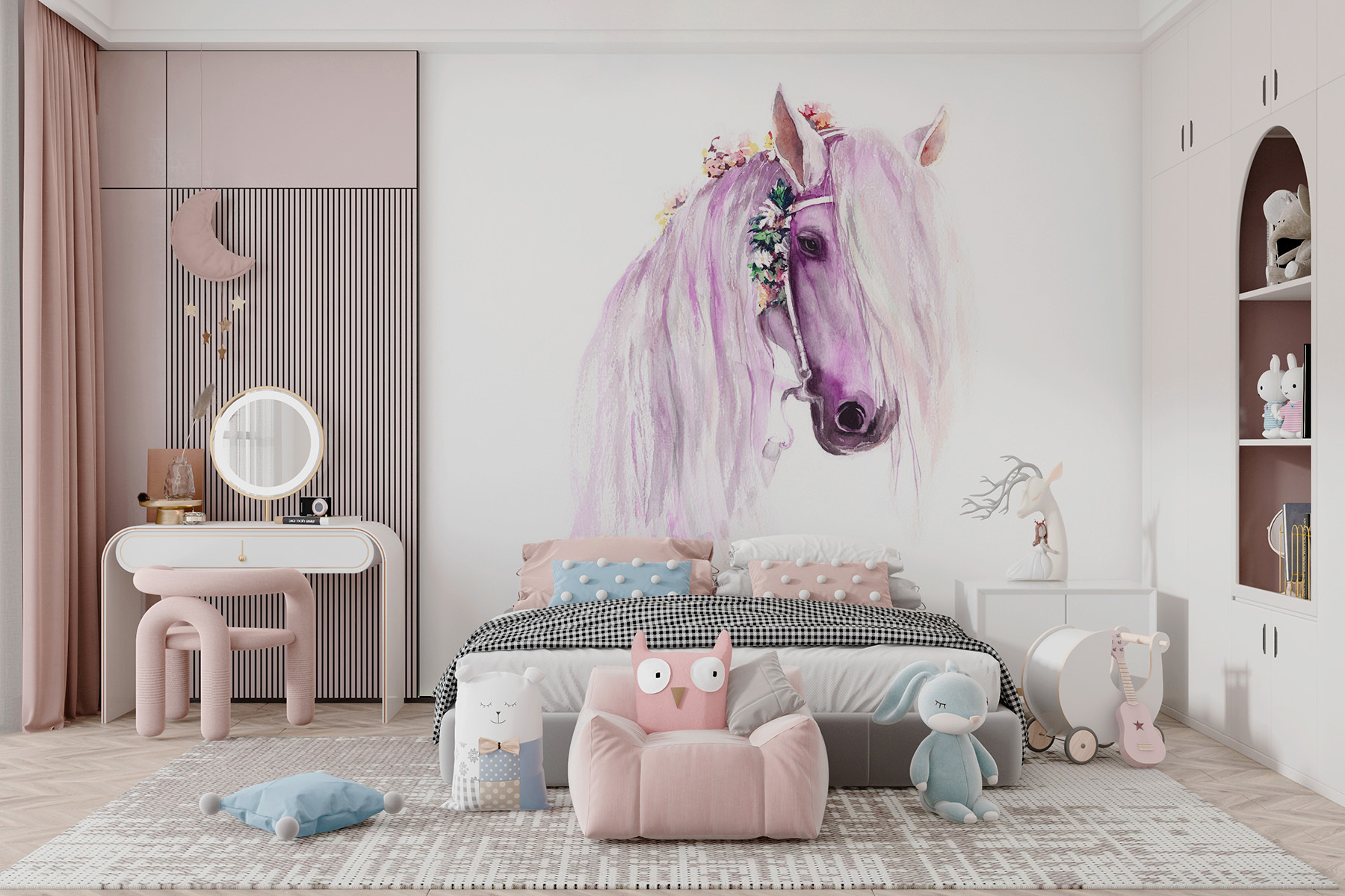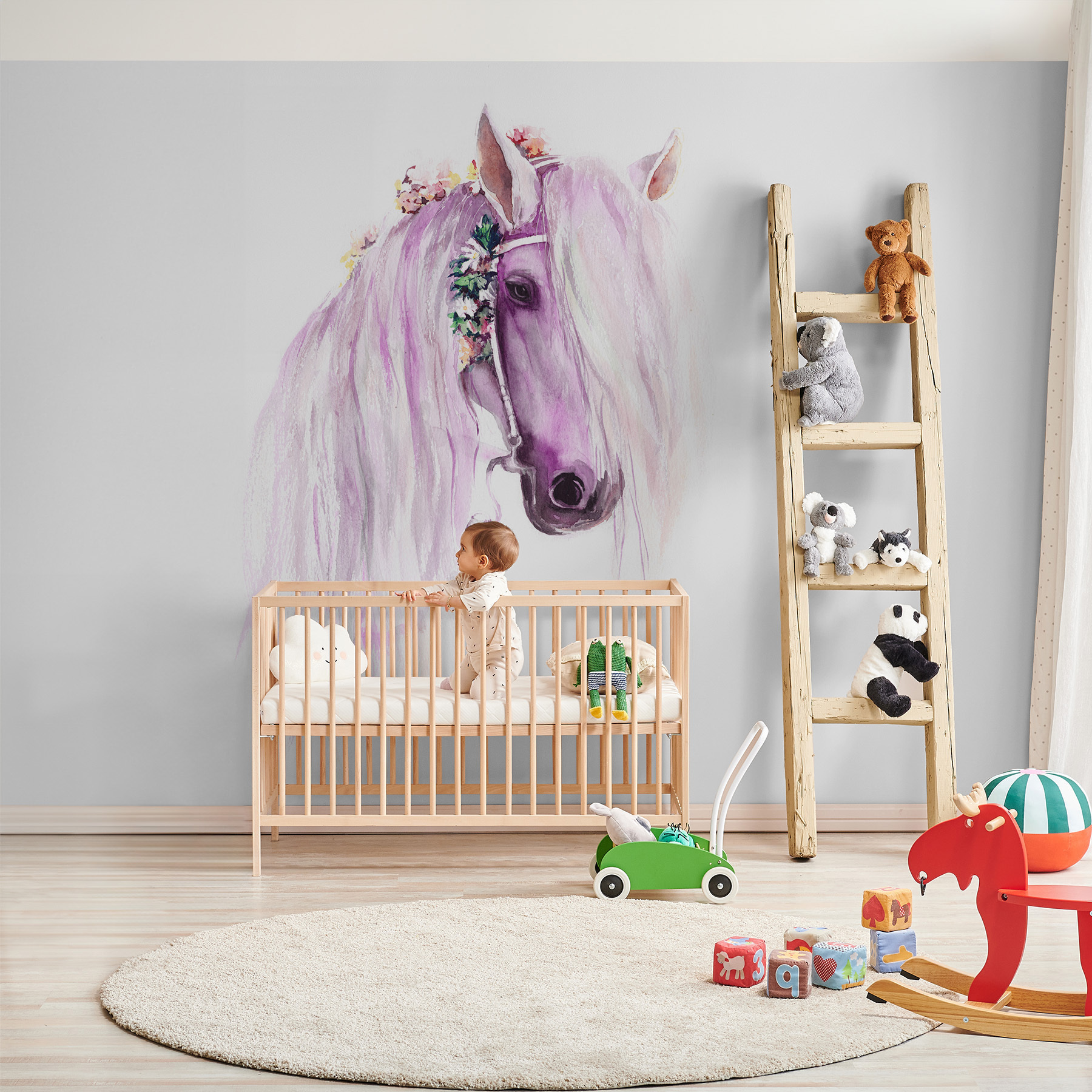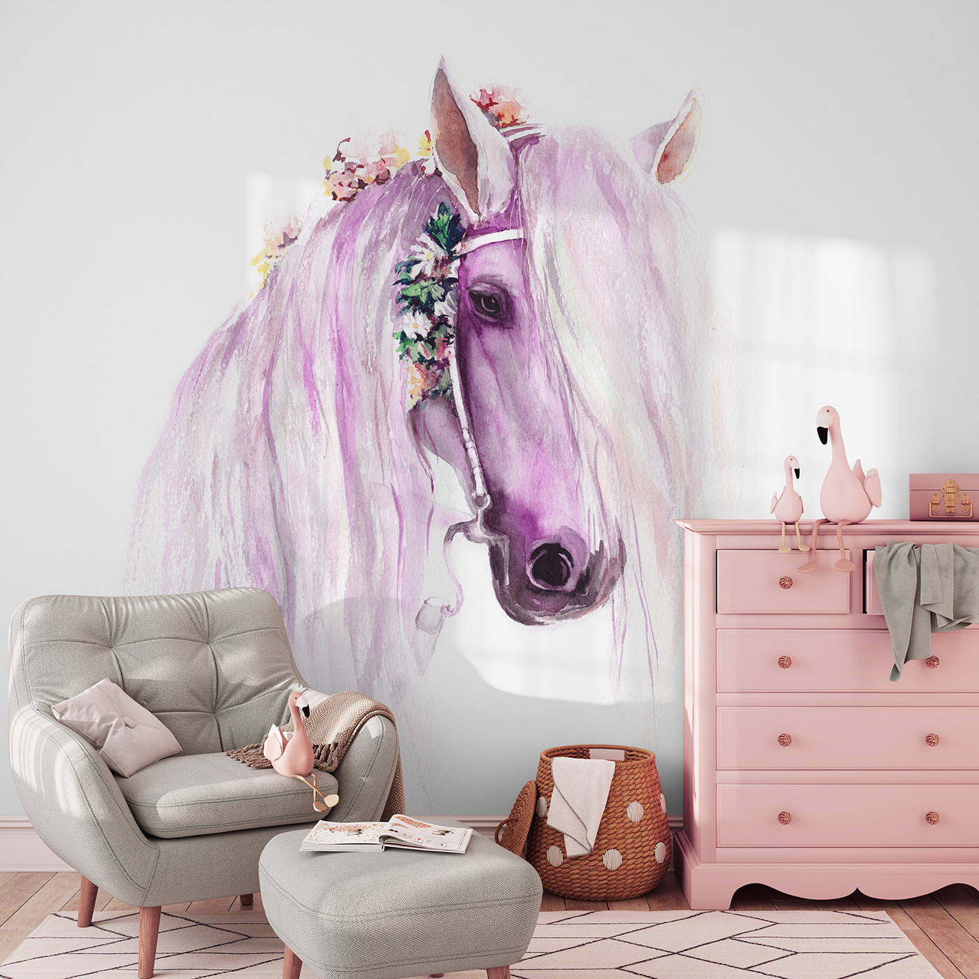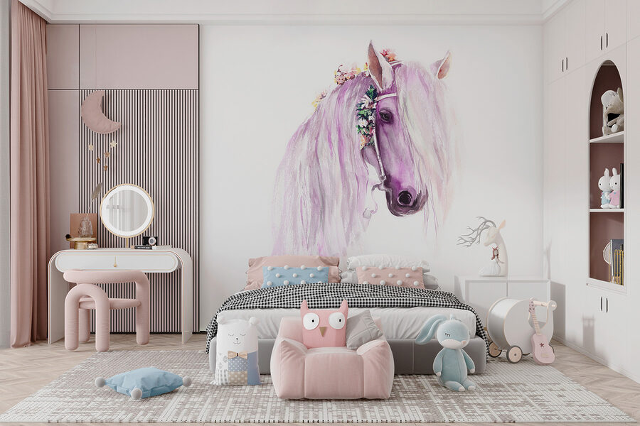 Premeňte miestnosť pomocou tejto nádhernej akvarelovej maľby s koňom, ktorý vyzerá ako z rozprávky. Predstavte si to očarenie, keď sa deti pozerajú na jeho vlajúcu hrivu, ktorá vnesie do detskej izby alebo detskej izby nádych rozmarnosti. Nie je to len obklad na stenu, je to pozvánka na snívanie. Predstavte si lenivé popoludnia strávené predstavovaním si dobrodružstiev na lúke, jemné farby zahaľujúce priestor do nežného objatia. Táto nástenná maľba ponúka očarujúce únik, ideálny na rozvíjanie mladej fantázie alebo na jednoduché oživenie fádnej steny. Kto by nechcel mať takého mýtického priateľa?
