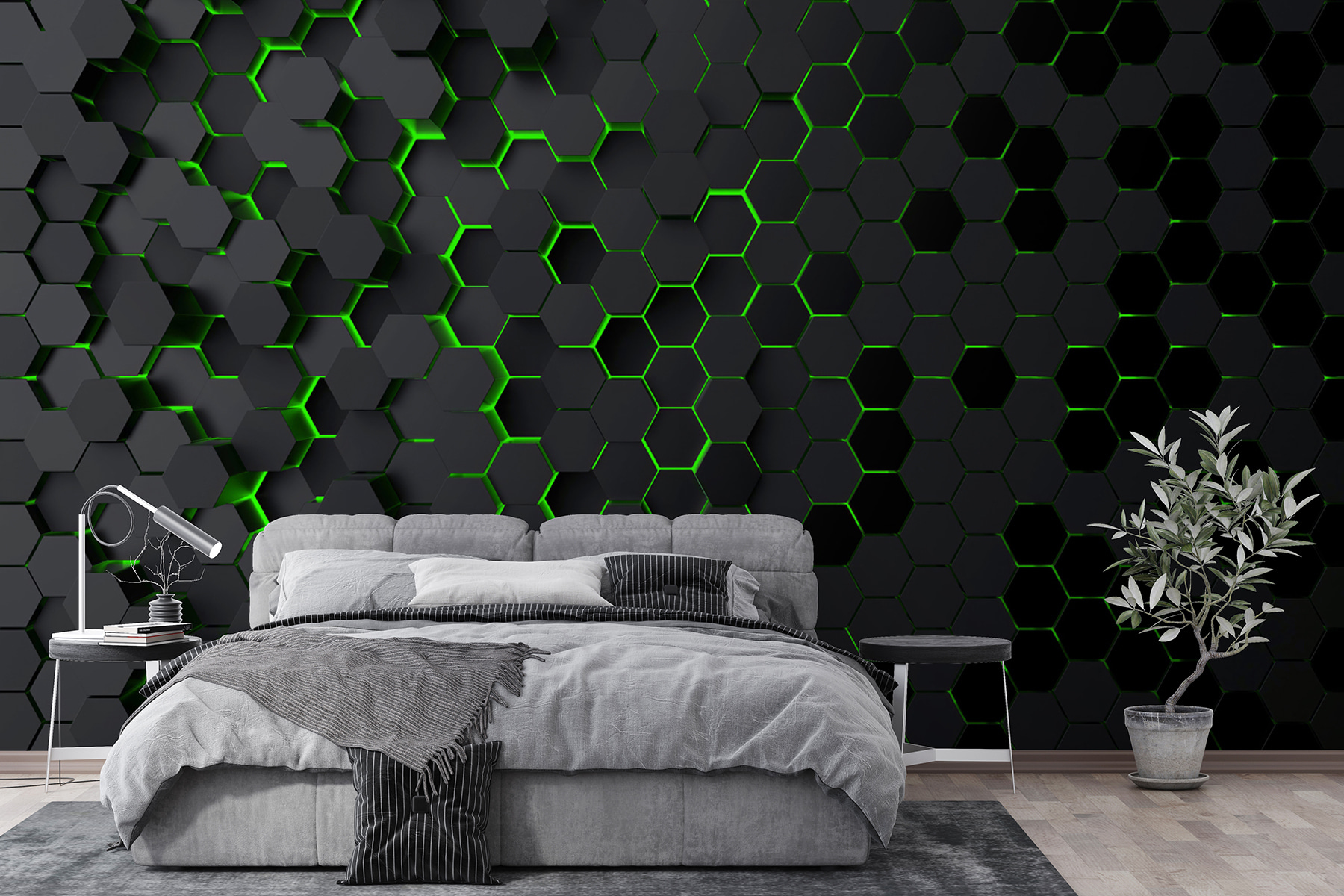 Pozrite si túto nástennú maľbu “Čierne šesťuholníky so zeleným svetlom”! Je to ako vstúpiť do futuristickej včelie plásty, ale chladnejšie. Predstavte si, že váš priestor – obývačka, kancelária, dokonca aj spálňa – dostane úplne novú atmosféru. Tie geometrické tvary sú také štýlové. A to zelené podsvietenie? Úplne nečakaný zvrat, ktorý vynikne najmä pri slabom osvetlení.