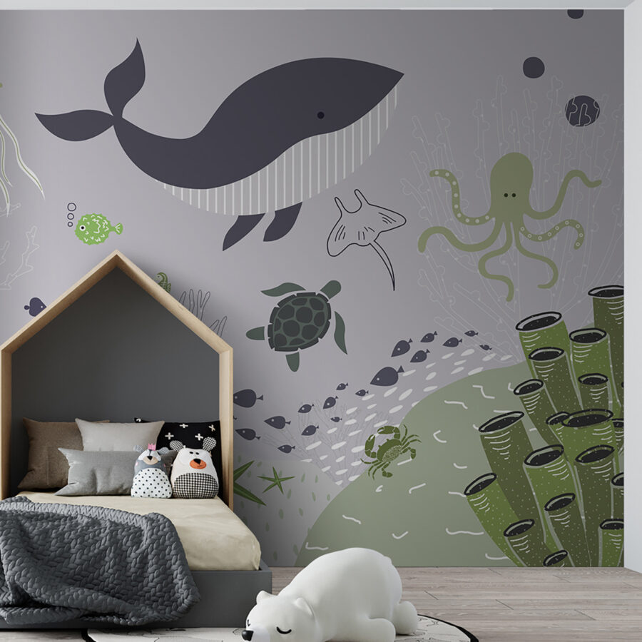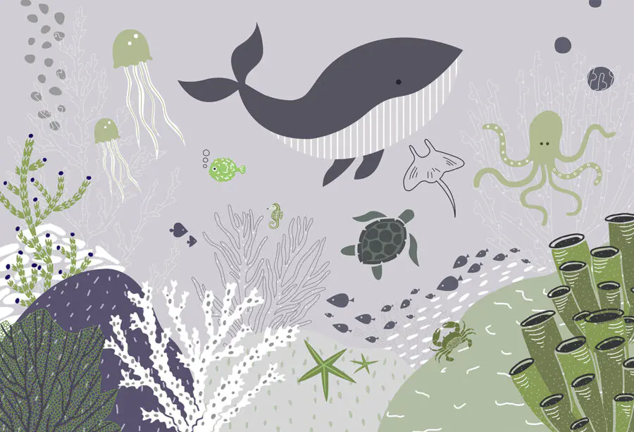 Ste pripravení premeniť svoje steny na podmorské dobrodružstvo? Pozrite si túto očarujúcu nástennú maľbu “Karikatúra veľryby”! Predstavte si hravú veľrybu, ku ktorej sa pridali jej rozkošní kamaráti z oceánu – medúzy, korytnačky a dokonca aj drzá chobotnica – a to všetko v útulnom, rozmarnom akvarelovom štýle. Je to ako ponoriť sa do čarovného mora priamo z vašej obývačky alebo detskej izby.