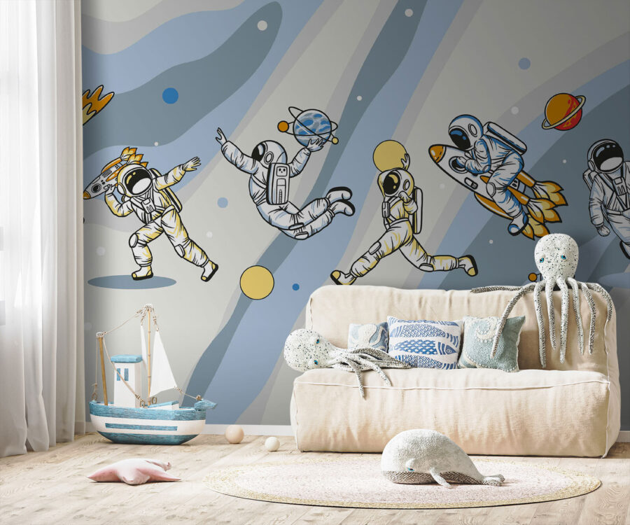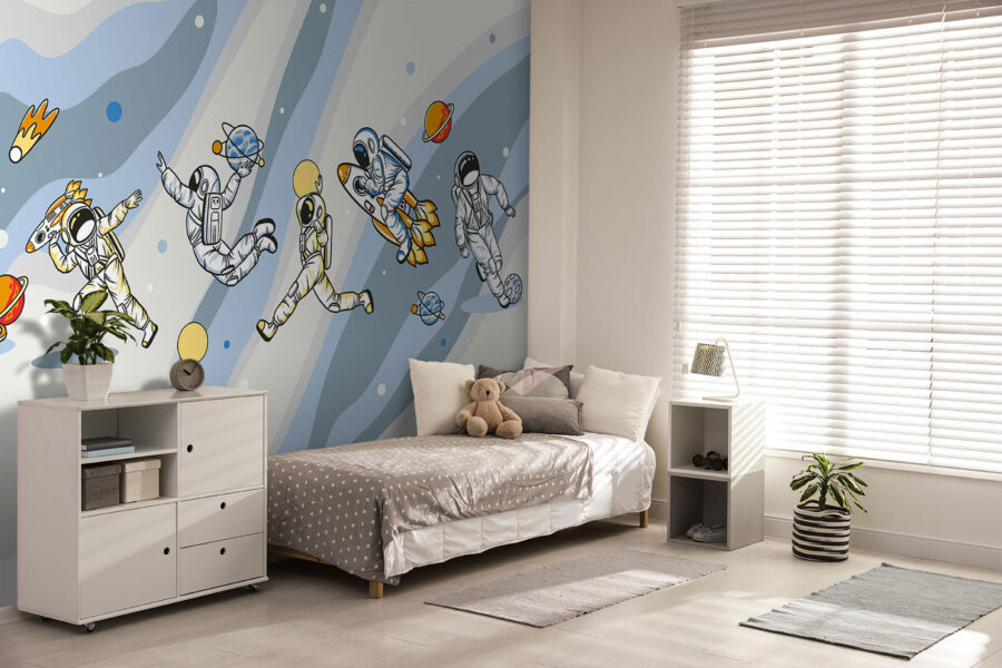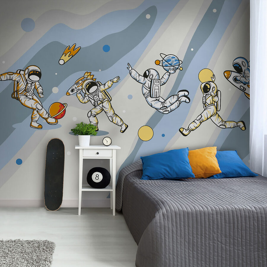 Pozrite si túto naozaj skvelú nástennú maľbu – “Karikatúra astronauta s raketou na hlave”. Je to ako oživený komiks, ktorý je ideálny na doplnenie zábavy a dobrodružstva v každej miestnosti. Predstavte si, že by ste ho mali v detskej izbe alebo v herni… Malé detaily, ako napríklad astronauti tancujúci okolo planét, vás jednoducho rozosmejú. Navyše úplne podnecuje predstavivosť – kto by nechcel snívať o vesmírnych cestách a raketových lodiach? Je zábavná, nepredvídateľná a tak trochu mimo, presne ako každé dobré dobrodružstvo. Je to super zábavný spôsob, ako urobiť priestor kreatívnym a živým!