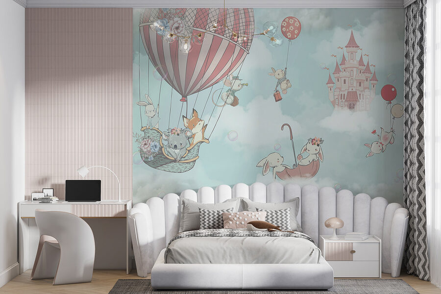 Malé deti si zamilujú pozorovanie očarujúcich detailov – koala s kvetinovou korunkou, malí zajačikovia s balónmi, všetci sa vznášajú medzi nadýchanými oblakmi so snovým hradom v pozadí. Celá scéna pôsobí pozitívne očarujúco, akoby mohli hneď po prebudení skočiť do svojej vlastnej rozprávky.