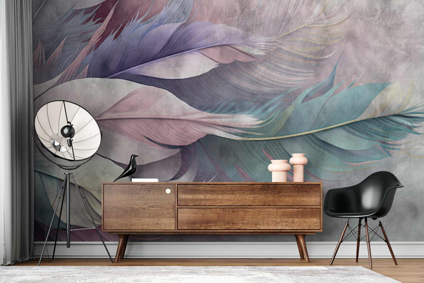 Premeňte svoj priestor pomocou tejto nástennej maľby s farebnými pierkami tancujúcimi na jemnom, tlmenom pozadí. Je to, akoby príroda priniesla na vaše steny štetec. Predstavte si, ako popíjate kávu v útulnom kútiku a len tak obdivujete tie jemné odtiene, ktoré akoby sa menili spolu so svetloružovou, tealovou a levanduľovou farbou víriacou v snovom objatí. Táto nástenná maľba nie je len dekoráciou, ale aj podnetom na konverzáciu a zlepšuje náladu. Či už v spálni alebo v živej obývačke, tieto pierka môžu navodiť pocit pokoja alebo podnietiť výbuch kreativity. Je to ako malé umelecké dielo, ktoré šepká do duše. Jeho zavesenie je ako pozvanie očarujúceho vánku dovnútra a úprimne, kto by to nechcel?