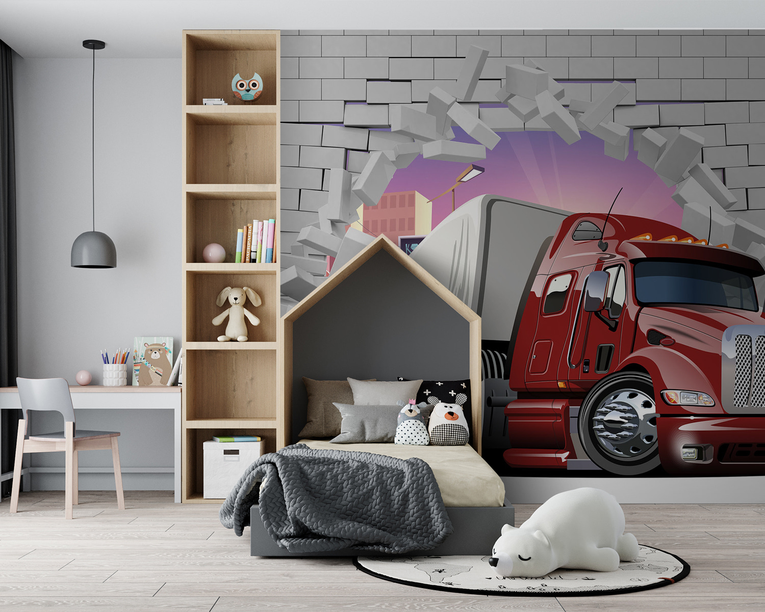 Táto nástenná maľba sa volá “Nákladiak prerazí stenu” a chlapec, zodpovedá svojmu názvu! Predstavte si, že cez stenu vašej obývačky prerazí obrovský červený kamión – je to ako prežiť scénu z akčného filmu. Máte dieťa posadnuté autami? Toto by im vyrazilo dych a možno by ich to prinútilo urobiť si domáce úlohy (držte im palce)! Detaily sú také ostré, že sa vám takmer chce uskakovať! Perfektne sa hodí na oživenie detskej izby alebo dokonca garáže. Ľudia budú mať dvojnásobný pohľad zakaždým, keď pôjdu okolo. Navyše to nie je len pre deti – nadšenci do áut by z toho boli nadšení. Oživte atmosféru svojho priestoru touto pútavou nástennou maľbou, ktorá vyvoláva rozhovory. Je neočakávaná, jedinečná a tak trochu rebelská!