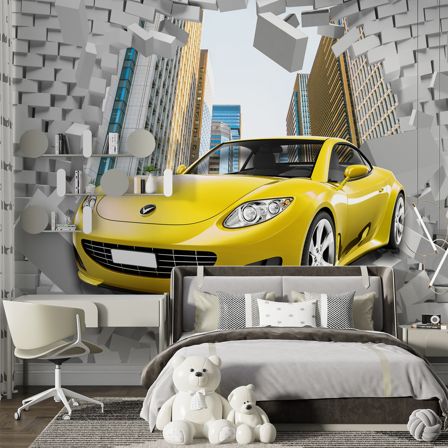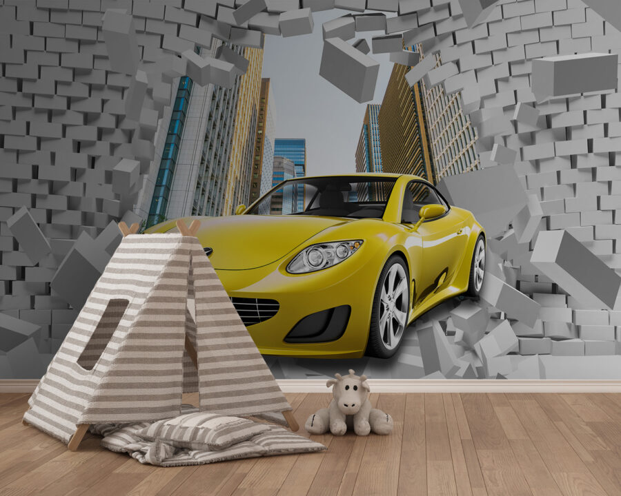 Premýšľali ste niekedy o tom, že by ste do svojej izby vniesli trochu vzrušenia? Predstavte si športové auto prerážajúce cez tehlovú stenu priamo na vašej stene! Táto nástenná maľba je ideálna, ak máte doma malého automobilového nadšenca – alebo dokonca len niekoho, kto miluje trochu dramatickej atmosféry. Je súčasťou kolekcií “Automobil” a “Tehlové steny”, ale fantasticky sa hodí aj do detských izieb. Energia rozbíjajúcich sa tehál a elegantného žltého auta dodáva obrazom farebný a akčný nádych. Je to ako pridať do svojho interiéru dávku adrenalínu. Vážne, viete si predstaviť tie výrazy na tvárach vašich hostí? Úplný showstopper.
