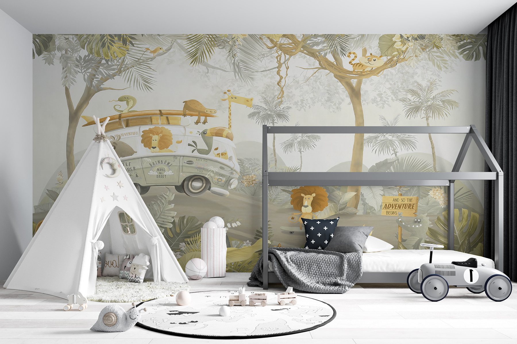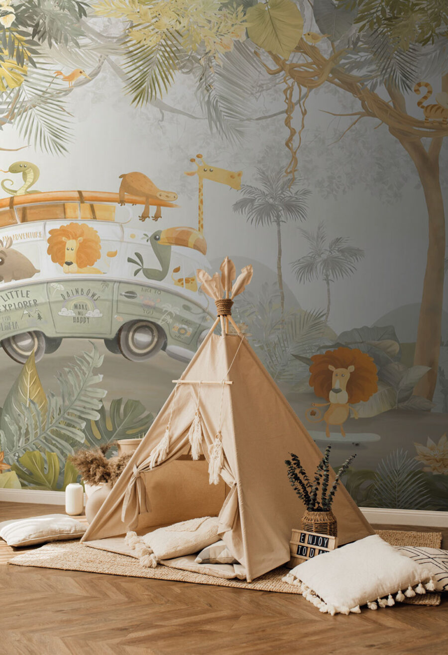 Táto nástenná maľba je ideálna pre malých objaviteľov a dodá každému priestoru štipku fantázie. Pôsobí ako z rozprávkovej knihy, okamžite vyčarí úsmev a podnieti kreativitu. Možno teraz bude rozprávka pred spaním zahŕňať leva, ktorý sa korčuľuje pri západe slnka, alebo možno každé ráno čarovnú prehliadku džungle. Cenovo dostupný a očarujúci materiál premení steny na rozprávkové zázračné krajiny – dokonalé pozadie pre detské sny a hravé chvíle. Každý pohľad na túto nástennú maľbu pripomína, že dobrodružstvo je hneď za rohom.