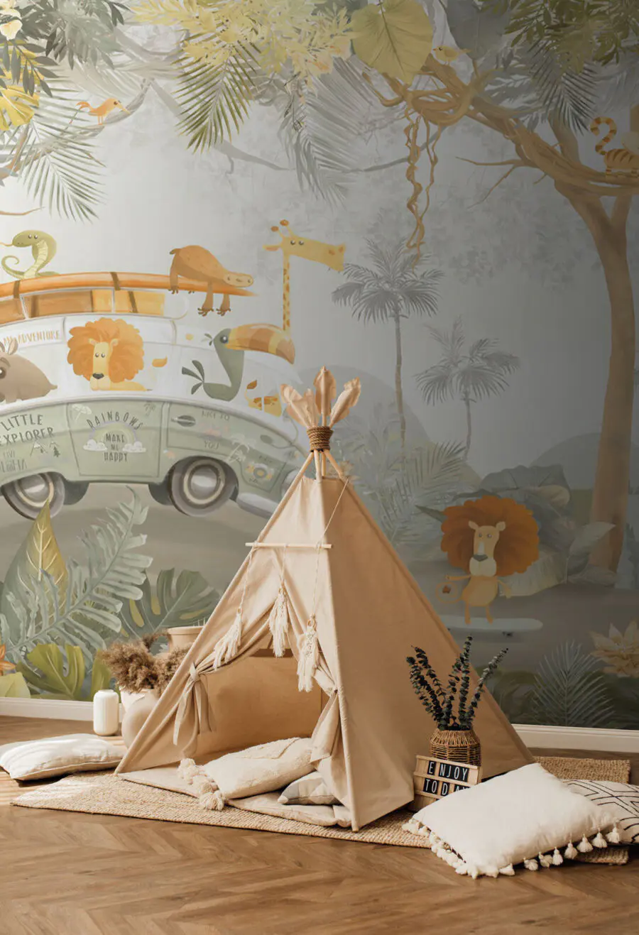 Táto nástenná maľba je ideálna pre malých objaviteľov a dodá každému priestoru štipku fantázie. Pôsobí ako z rozprávkovej knihy, okamžite vyčarí úsmev a podnieti kreativitu. Možno teraz bude rozprávka pred spaním zahŕňať leva, ktorý sa korčuľuje pri západe slnka, alebo možno každé ráno čarovnú prehliadku džungle. Cenovo dostupný a očarujúci materiál premení steny na rozprávkové zázračné krajiny – dokonalé pozadie pre detské sny a hravé chvíle. Každý pohľad na túto nástennú maľbu pripomína, že dobrodružstvo je hneď za rohom.