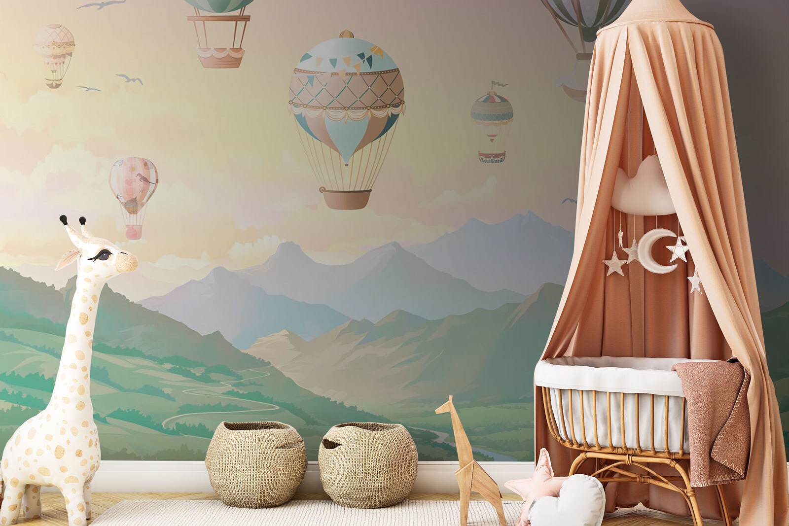 Premeňte detský priestor na rozmarnú krajinu zázrakov pomocou tejto nástennej maľby s teplovzdušným balónom! Predstavte si to: jemný východ slnka vrhá jemné odtiene na celú miestnosť, zatiaľ čo farebné balóny sa pokojne vznášajú na pozadí zasnenej krajiny. Je to ako pozvať do svojho domova kúsok dobrodružstva bez toho, aby ste si museli baliť tašku. Deti si môžu predstaviť, ako sa vznášajú v nadýchaných oblakoch alebo organizujú čajové večierky na oblohe s hravými vlajkami tancujúcimi vo vetre. A tu je to najlepšie – takáto nástenná maľba nielenže podnecuje kreativitu, ale prináša aj pokojné čaro, ideálne na spanie alebo rozprávkové posedenia. Sledujte, ako sa malé tváre rozžiaria snami o rozmarných cestách; je to viac než dekorácia – je to pozvánka na objavovanie!