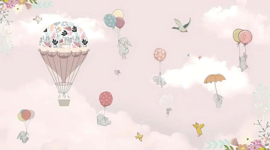 Predstavte si, že sa zobudíte do očarujúceho sveta, v ktorom sa rozkošní zajačikovia vznášajú po oblohe, držia farebné balóny a dáždniky – táto nástenná maľba je čistým kúzlom pre každú detskú izbu! Jemné pastelové odtiene a rozmarné teplovzdušné balóny vytvárajú zasnený únik priamo na stene. Je to ako vstúpiť každé ráno do rozprávkovej knihy. Ideálna na rozprúdenie predstavivosti a dodanie štipky šarmu. Navyše, kto by sa neusmieval na zajačika lietajúceho s dáždnikom? Skvelé pre deti a všetkých, ktorí sú mladí srdcom. Táto nástenná maľba prakticky šepká príbehy na dobrú noc! Príjemné vibrácie zaručené.