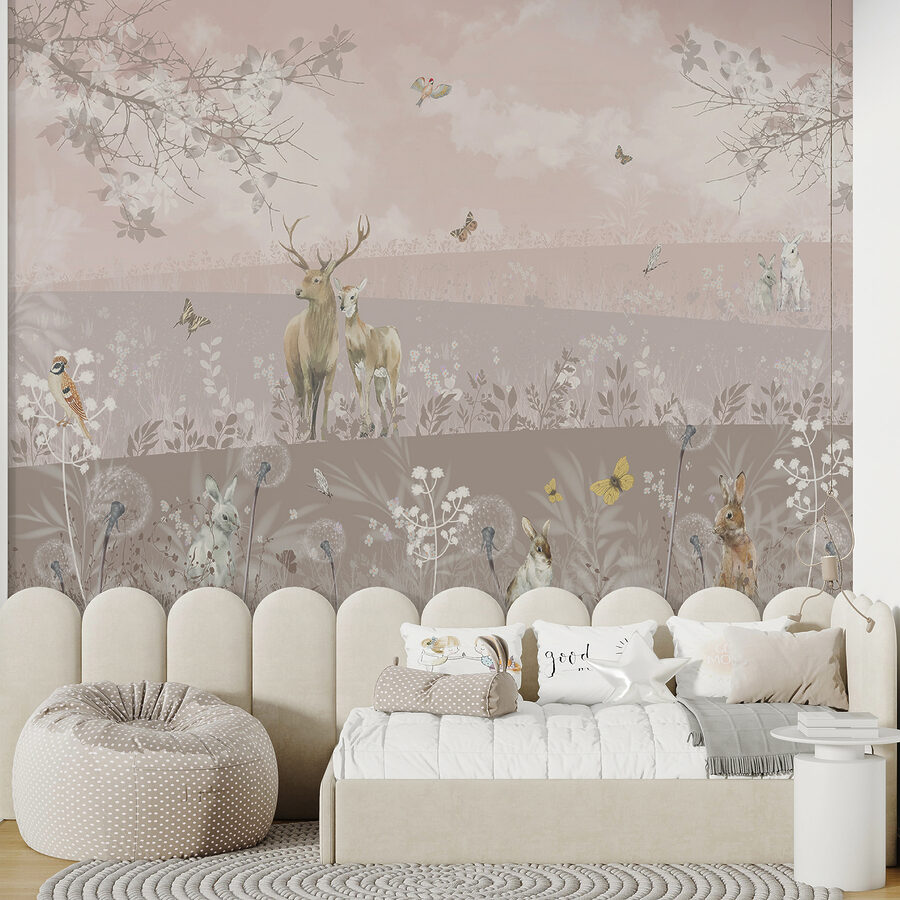 Predstavte si, že vstúpite do miestnosti, ktorá pripomína zasnený les, kde sa srnky a zajace náhodne potulujú a vôbec ich neruší svet. Presne takú atmosféru vám navodí nástenná maľba “Jelene a králiky v pokojnej krajine”. Je ideálna na premenu akéhokoľvek priestoru na pokojné útočisko. Či už ide o dcérinu izbu, útulný kútik, alebo dokonca obývačku, táto nástenná maľba prináša krásu prírody dovnútra. Pri pití rannej kávy sa budete zasnívať, predstavovať si jemný vánok a šumenie lístia. Svojimi jemnými odtieňmi a rozkošnými divokými zvieratami si prakticky pýta dobrú knihu alebo chvíľu ticha. Ak ste teda chceli pridať na svoje steny trochu kúzla, toto je vaša voľba. Navyše, kto by nechcel mať kúsok lesnej mágie priamo doma?