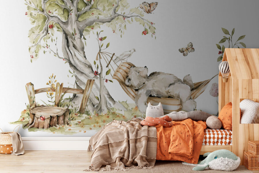 Nie je to to najroztomilejšie? Predstavte si túto nástennú maľbu “Medveď sníva v pokojnej hojdacej sieti” v izbe vášho dieťatka – hovoríme o zasnenom úteku! Predstavte si príjemného medveďa ležiaceho v hojdacej sieti pod rozmarným stromom, okolo ktorého poletujú motýle. Je to ako scéna z rozprávky, ideálna na vytvorenie týchto čarovných vibrácií v detských izbách alebo herniach.