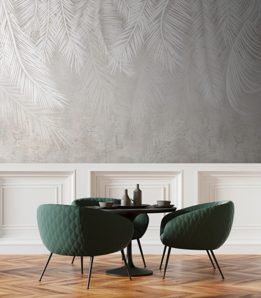 Premeňte akúkoľvek miestnosť pomocou tejto podmanivej nástennej maľby s bielymi listami na jemnom sivom pozadí. Je to ako preniesť pokojný les do vášho priestoru, bez chrobákov a konárov vo vlasoch. Predstavte si, že popíjate kávu v jasnej, vzdušnej miestnosti s týmto elegantným dizajnom – dodáva upokojujúcu atmosféru, ktorá je ideálna pre chvíle, keď sa vám život zdá príliš hektický. A kto by nechcel, aby mu steny šepkali sladké slová o prírode? Táto nástenná maľba vytvára scénu pre útulné večery alebo živé stretnutia. Je jednoduchá, nápadná a rozhodne vyvolá konverzáciu!