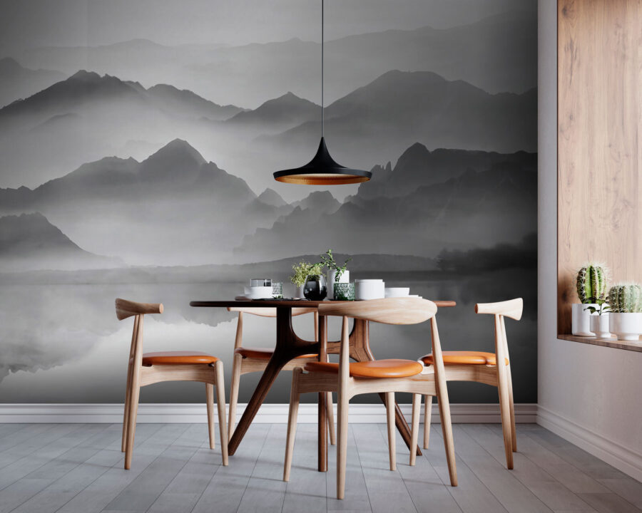 Predstavte si, že by vaša stena bola ozdobená touto veľkolepou nástennou maľbou “Hmlistá krajina s horami”. Je to ako pozerať sa z okna útulnej chaty vysoko v horách, ale bez toho, aby ste museli opustiť svoju obývačku. Zdá sa, že tie hmlisté vrcholy a zasnené údolia sa tiahnu donekonečna, však?