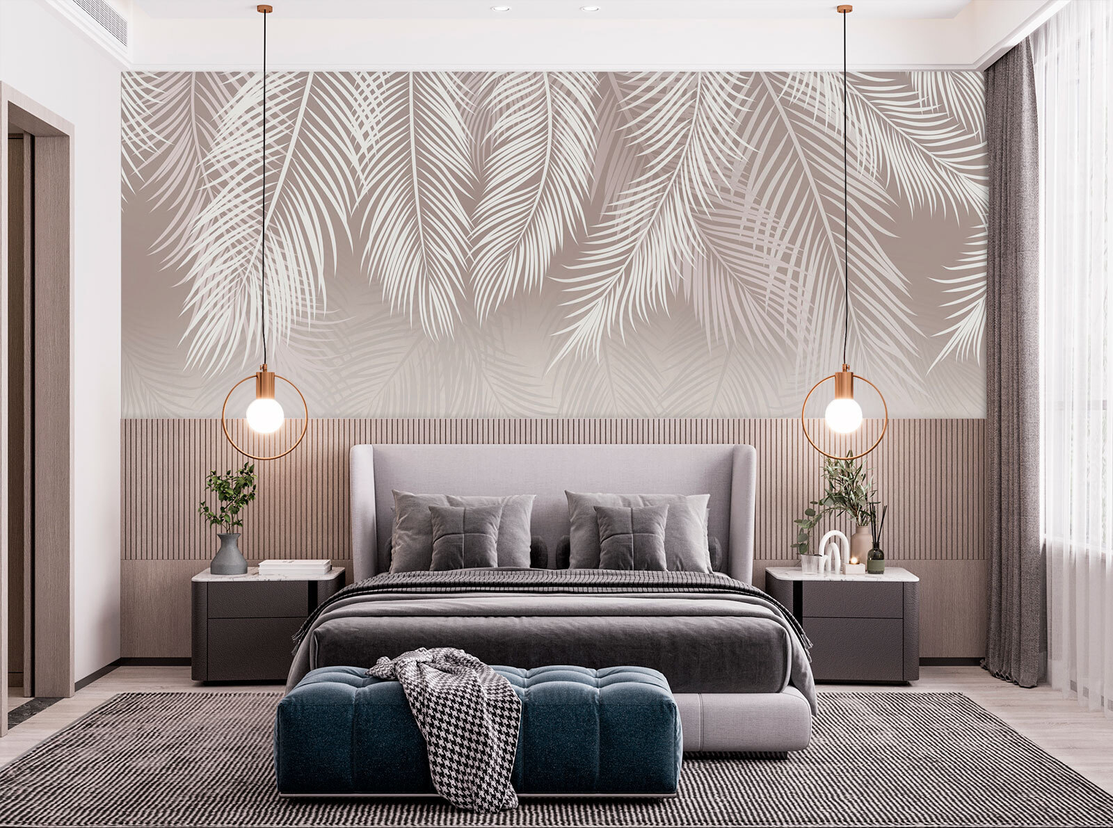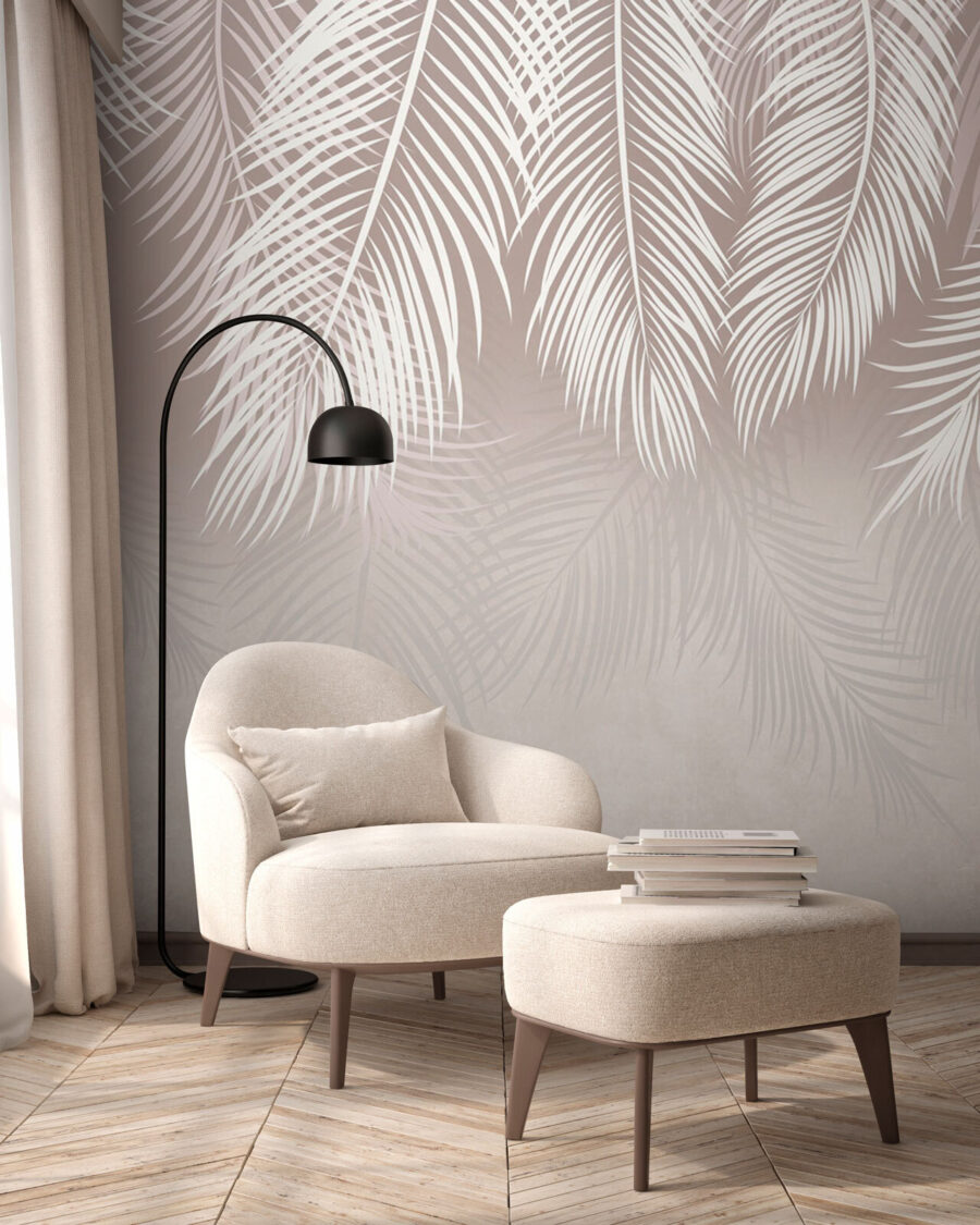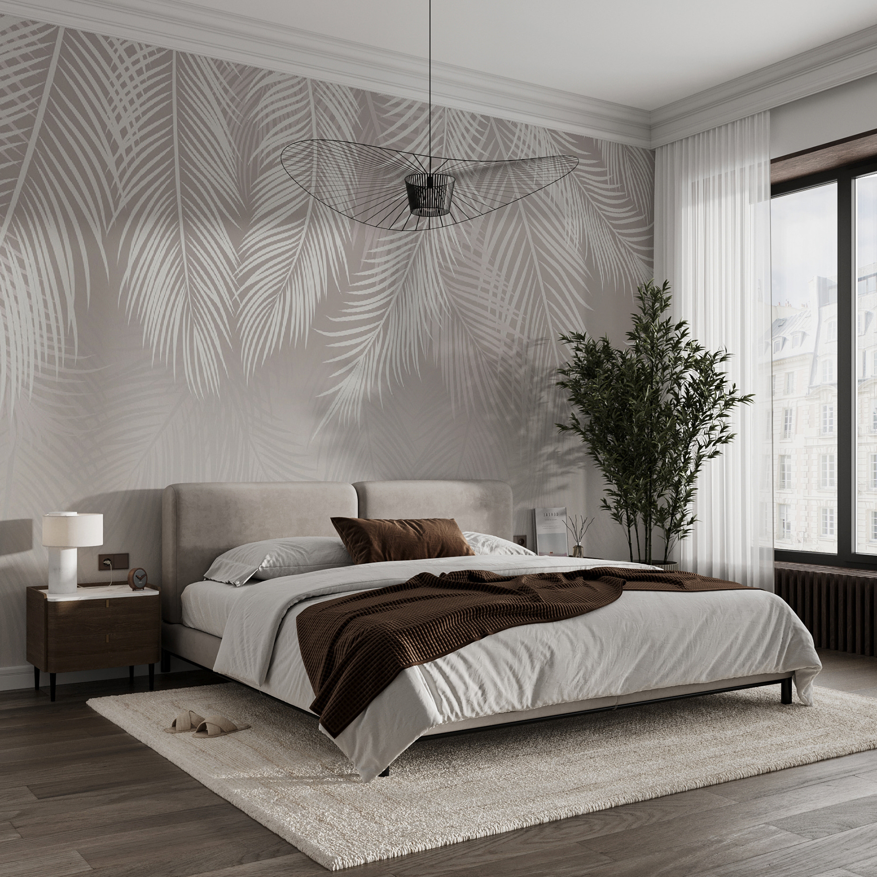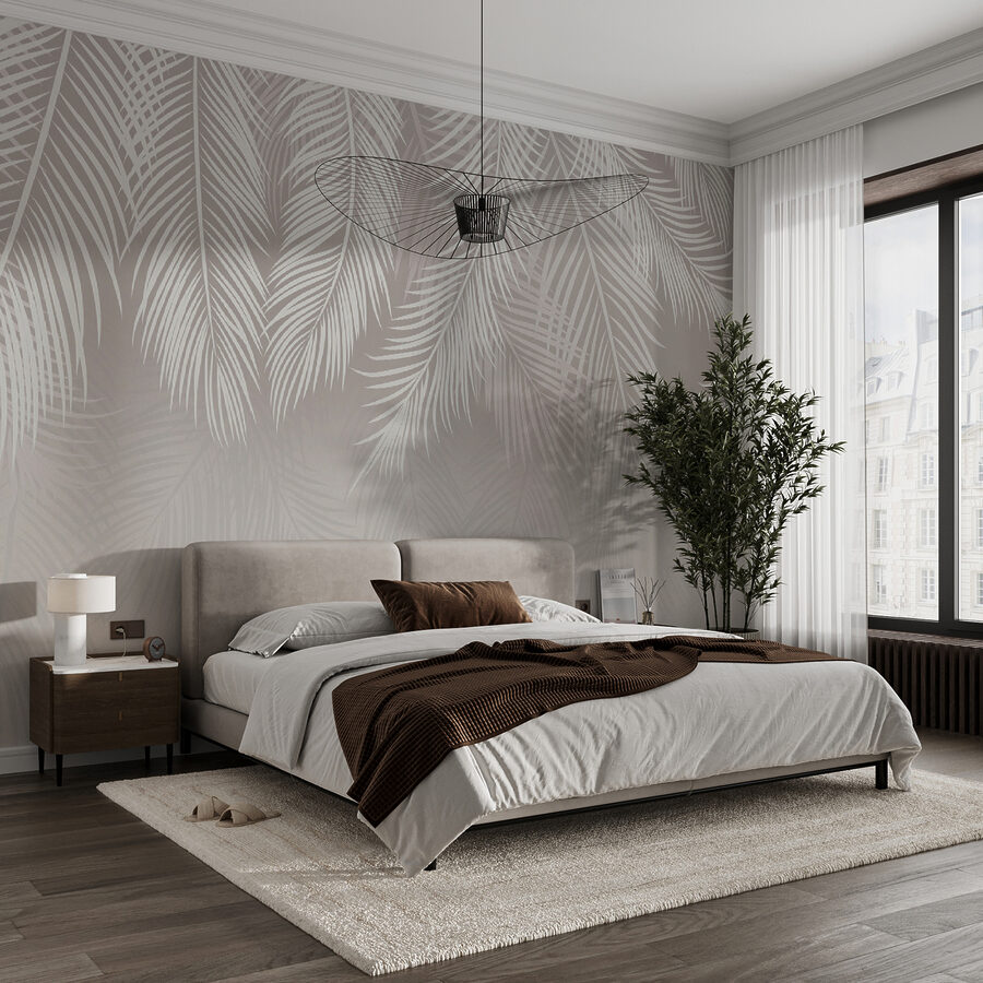 Premeňte svoj priestor pomocou tejto elegantnej nástennej maľby so vzorom palmových listov, ktorá je dokonalou kombináciou pokoja a štýlu. Predstavte si, že vstúpite do miestnosti, ktorá pri každom pohľade šepká relaxáciu. Mäkké, jemné listy vytvárajú upokojujúce pozadie, akoby ste vstúpili do pokojného tropického raja bez toho, aby ste opustili svoj domov. Je to ako mať mini dovolenku priamo na stene. Priatelia sa možno opýtajú, či ste si nainštalovali okno do nejakej sviežej záhrady. Táto nástenná maľba, ktorá je ideálna do útulného čitateľského kútika alebo živej obývačky, prináša do interiéru závan čerstvého vzduchu a nádych prírody.