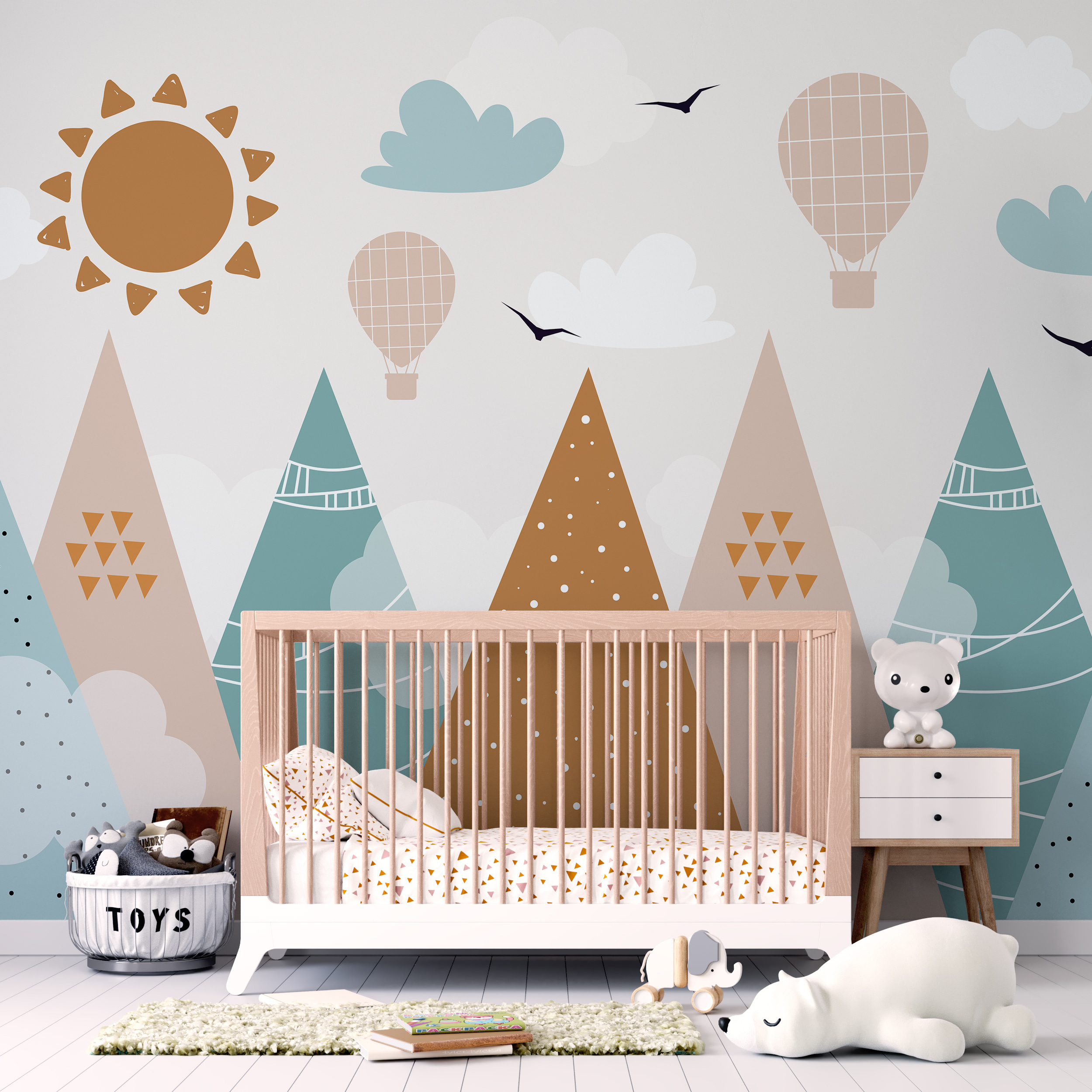 Predstavte si, že sa zobudíte v teplovzdušnom balóne, ktorý sa vznáša nad farebnými horami a jasnou slnečnou oblohou – ale je priamo na vašej stene! Táto fototapeta “Hory a balóny pod slnečnou oblohou” je ako malé dobrodružstvo každý deň. Je rozmarná bez toho, aby bola príliš hlučná, takže je ideálna do izby vášho dieťatka. Pastelové farby sú upokojujúce a zároveň priateľské, čím dodávajú miestnosti veselú atmosféru. Je to ako mať dotyk veľkej prírody, bez chrobákov a počasia. Navyše si predstavte, aké príbehy pred spaním môžete s týmto pozadím vytvoriť – toľko inšpirácie!