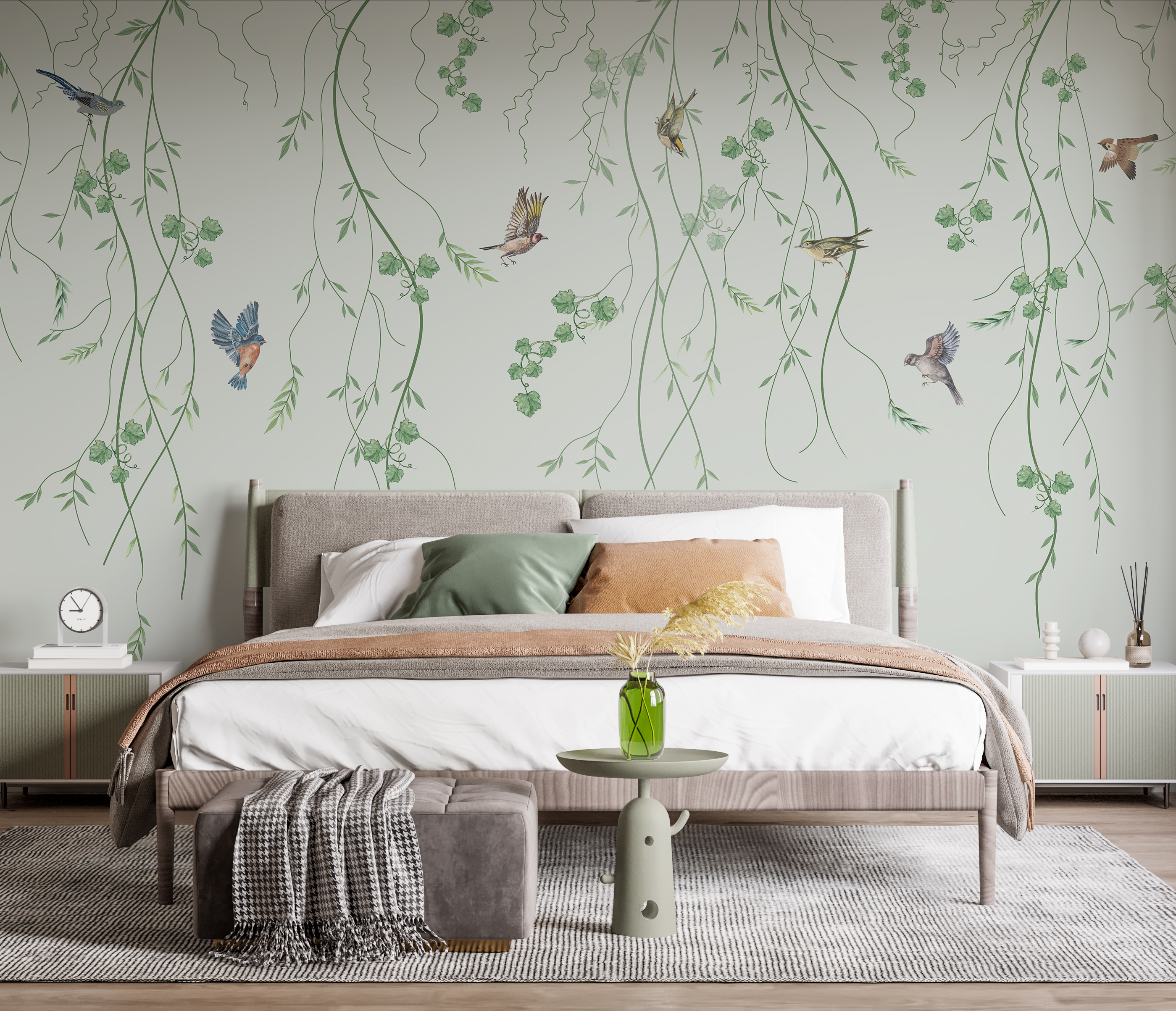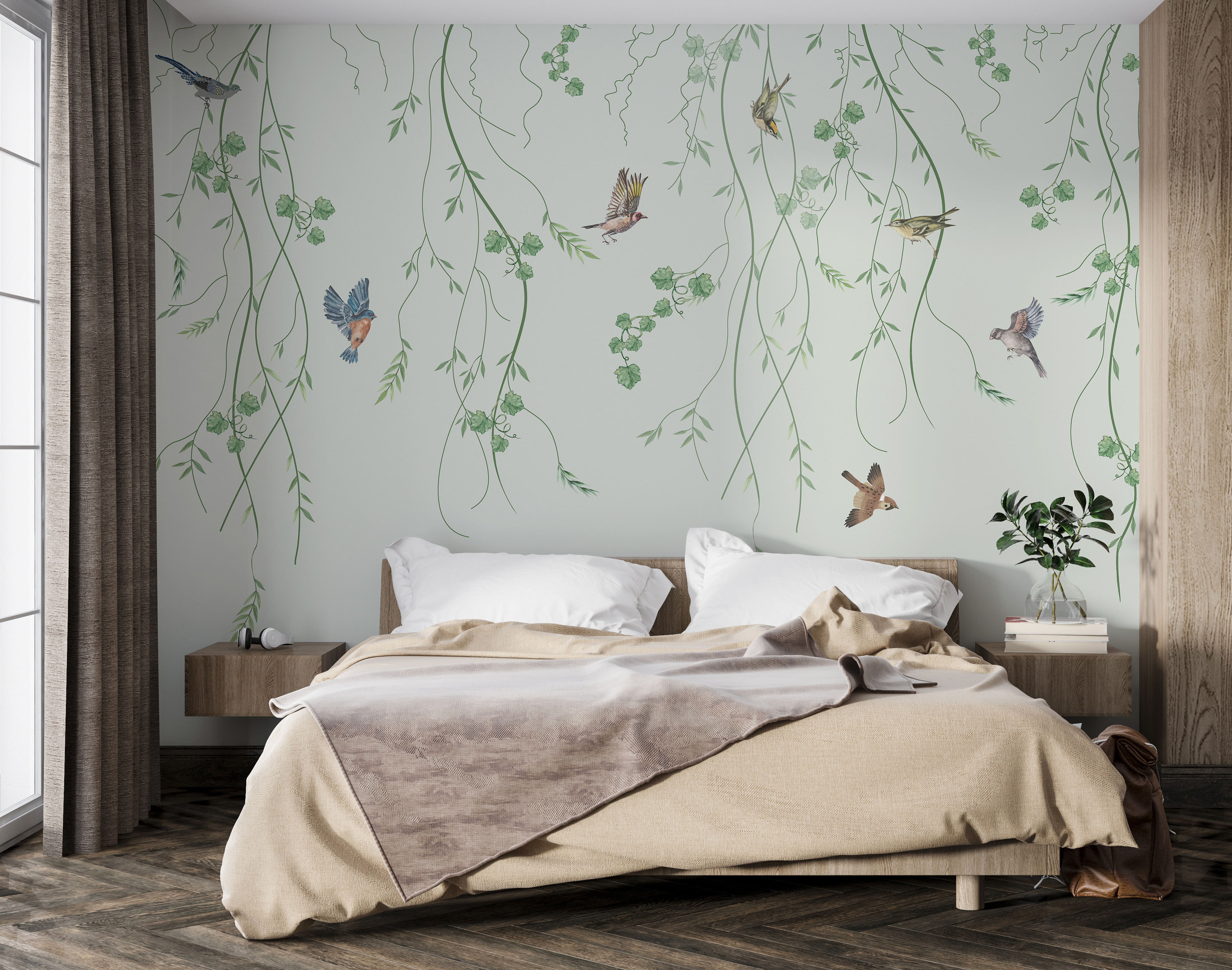 Predstavte si, že pri popíjaní rannej kávy si do interiéru prenesiete sviežosť vonkajšej záhrady. “Nástenná maľba Vtáky poletujúce medzi visiacimi lianami” je ako umiestniť si na stenu kúsok prírody. Vtáky uprostred letu, visiace bujné liany – jednoducho nádhera. Človek by si takmer myslel, že sú živé. Perfektne sa hodí do obývačky, spálne alebo aj do domácej kancelárie. Má tú pokojnú, upokojujúcu atmosféru, po ktorej všetci túžime po dlhom dni. Útulný, a pritom elegantný. Taký, ktorý vám vyčarí úsmev na tvári zakaždým, keď okolo neho prejdete. A kúsok kúzla prírody? Vždy dobré idea❤️