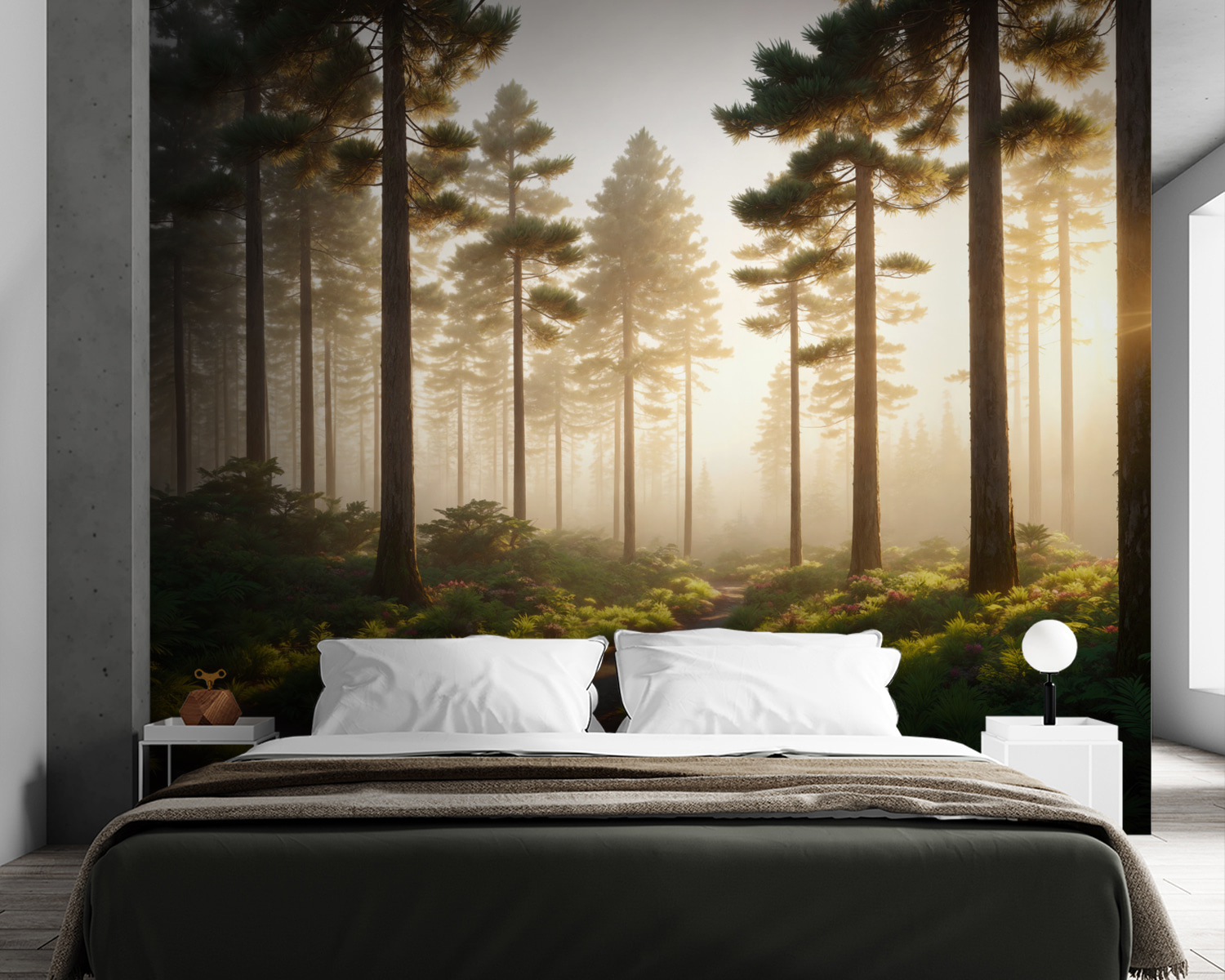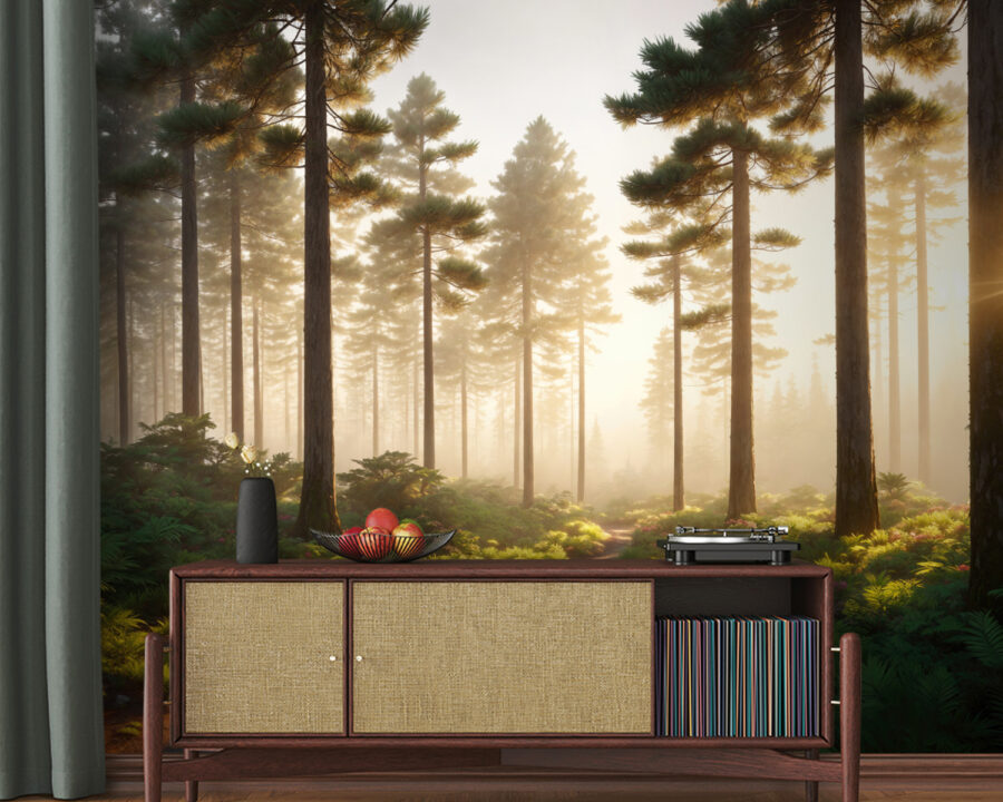 Premeňte akýkoľvek priestor vďaka pokojným vibráciám tejto nástennej maľby s pokojnou lesnou cestou pri východe slnka. Predstavte si, ako sa každé ráno prebúdzate do tejto pokojnej scény, kde jemné svetlo preniká cez vysoké stromy a vytvára útulnú atmosféru. Je to ako mať prírodu v interiéri, bez chrobákov a zablatených topánok. Predstavte si, ako popíjate kávu, stratení v myšlienkach a pritom sa pozeráte na tento pokojný výhľad. Žiarivá zeleň a teplé tóny môžu vyvolať malé snívanie o potulkách lesom. Táto nástenná maľba je ideálna do obývacej izby alebo útulného čitateľského kútika, vnáša do interiéru atmosféru vonkajšieho prostredia a pozýva na relaxáciu a kúzlo.
