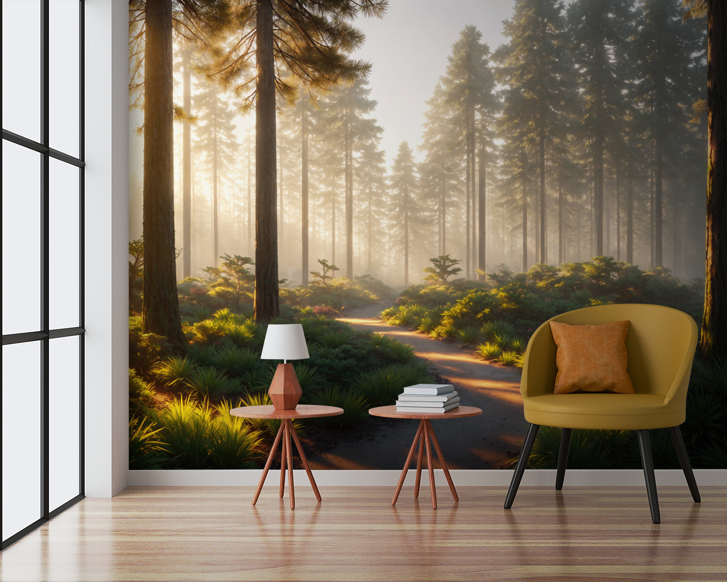 Premeňte svoj priestor na pokojný únik s nástennou maľbou Sunlit Forest Path Through Trees. Predstavte si, že priamo z vašej obývačky vstúpite do pokojného lesa. Mäkké ranné svetlo prenikajúce cez vysoké stromy vytvára pokojnú atmosféru. Je to ako jemná pripomienka tichých výletov a šepotavého vánku, ideálna na denné snívanie alebo chvíľkové zastavenie v chaose života. Táto nástenná maľba prináša teplo a závan čerstvého vzduchu a pozýva prírodu priamo do interiéru. Navyše vás môže inšpirovať k tomu, aby ste si vzali turistické topánky a vyrazili na cestu – pozor na veveričky!