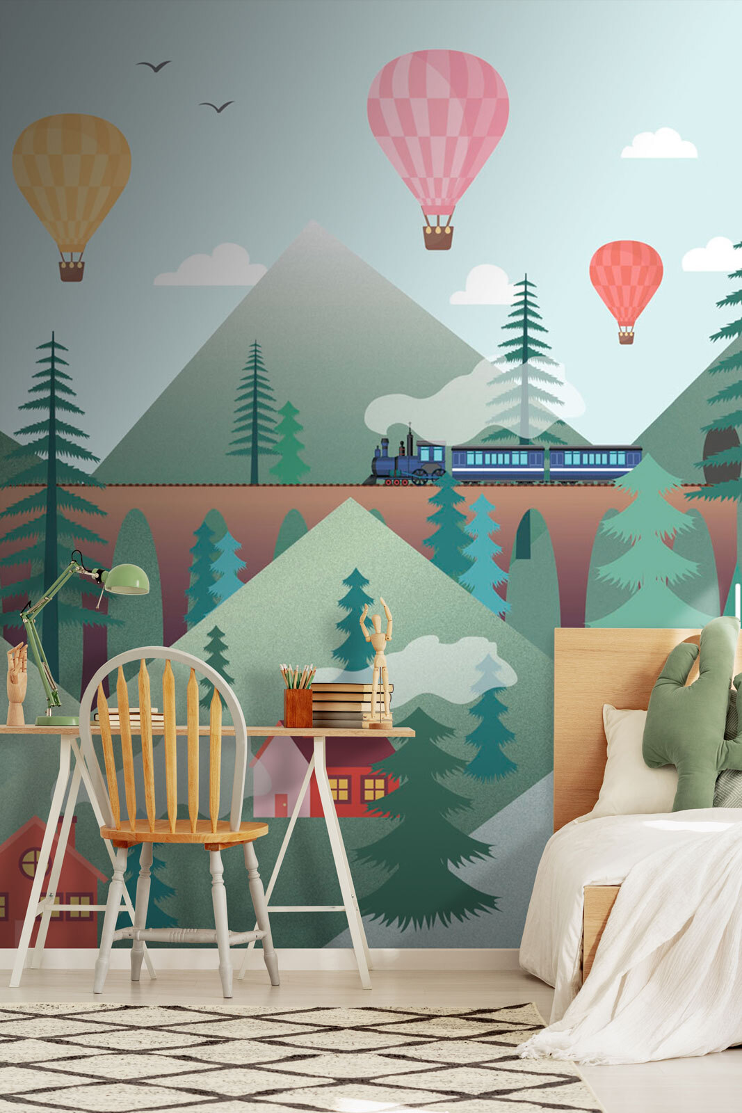 Snívali ste niekedy o tom, že sa budete vznášať v teplovzdušnom balóne? Táto rozmarná nástenná maľba “Ružový balón” by mohla byť ďalším najlepším riešením. Predstavte si, že detskú izbu alebo herňu premeníte na pastelový raj, v ktorom sa farebné balóny vznášajú nad pôvabnými domami a majestátnymi horami. Je to ako stránka z rozprávkovej knihy, kde každý pohľad podnecuje predstavivosť vášho dieťatka. Jasný, zábavný a skutočne rozkošný obraz vnesie do každej miestnosti pocit pokoja a zázraku. Navyše, kto by nemal rád útulné, malebné pozadie pre rozprávky pred spaním alebo dobrodružstvá počas hry? Tieto drobné detaily – dym z komínov a pokojné hory – dodávajú obrázku kúzlo, ktoré je tak lákavé. Nie je to len dekorácia, je to každodenná dávka radosti zabalená do nástennej maľby.