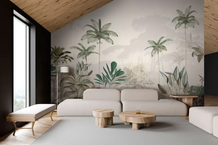 Predstavte si, že zakaždým, keď vojdete do miestnosti, vstúpite do svojho vlastného tropického útočiska – presne to do vášho priestoru vnesie táto nástenná maľba “Tropické stromy v hmlistom lese”. Predstavte si svieže, zelené palmy, ktoré sa jemne kolíšu vo vrstvách mäkkého, hmlistého lesa v pozadí. Odtiene zelenej sú upokojujúce, ale zároveň dostatočne živé, aby dodali šmrnc prírode. Je to ako mať večný únik do dažďového pralesa priamo vo svojom domove. Ideálny pre milovníkov prírody, ktorým chýba každodenná dávka pobytu na čerstvom vzduchu. Táto nástenná maľba pôsobí živo, takmer akoby ste cítili rannú hmlu na svojej pokožke a počuli jemné šumenie listov. Je to krásna rovnováha medzi pokojom a povzbudením, takže je ideálna na vytvorenie pohodovej, pokojnej atmosféry vo vašej obývačke, spálni alebo dokonca v útulnom čitateľskom kútiku. Navyše je to úžasný podnet na konverzáciu pre hostí – kto by sa nechcel stratiť v tomto zasnenom lese?