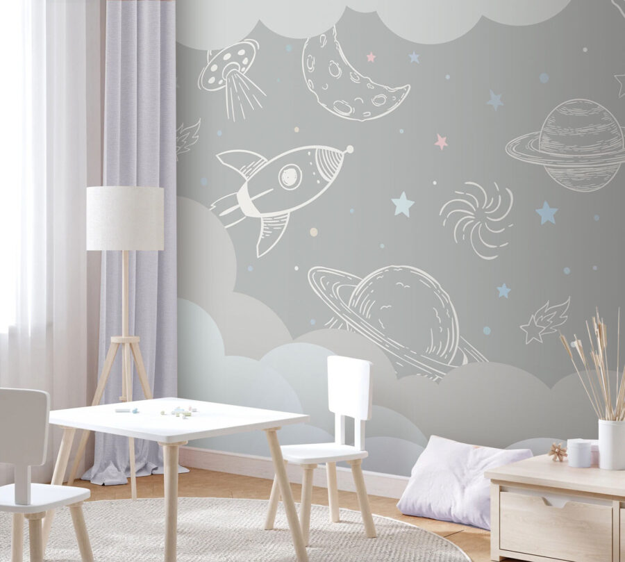 Pozrite si túto očarujúcu nástennú maľbu “Biela hviezda na sivom pozadí!” Je to ako zasnená cesta vesmírom priamo vo vašej izbe. Ideálna pre deti, najmä pre tie, ktoré nemôžu prestať hovoriť o raketách a astronautoch. Len si predstavte, ako sa tí najmenší večer ukladajú do postele a cítia sa ako medzi hviezdami. Má to ručne kreslenú atmosféru s vesmírnymi loďami, planétami a hviezdami – ako čmáranice z vesmírneho denníka.