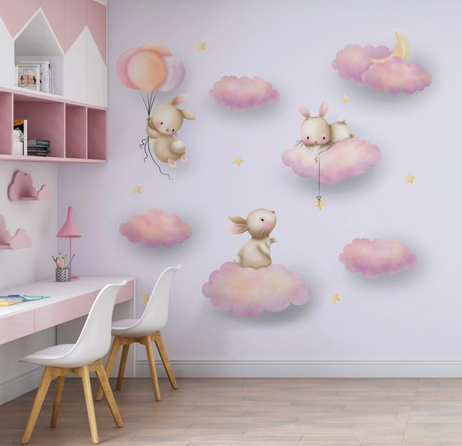 Premeňte akýkoľvek priestor na rozprávkovú oázu s touto nádhernou tapetou, na ktorej je vyobrazená skupina rozprávkových zajačikov plávajúcich na oblakoch. Predstavte si týchto chlpáčikov vznášajúcich sa na pastelovom nebi, z ktorých každý dodáva priestoru hravý šarm. Táto tapeta je ideálna do detskej izby alebo detskej škôlky a zaručene rozžiari radosť a fantáziu. Predstavte si, ako ožívajú rozprávky na dobrú noc na tomto pozadí, alebo ako snívate pod jemnými farbami. Či už ide o útulný kútik alebo herňu, prináša to srdcervúci, magický dotyk, ktorý dáva každému pocit ľahkosti. Kto by sa neusmial na zajačika držiaceho balóny? Je to ako jemná pripomienka, aby ste naďalej snívali, aj keď je život rušný.