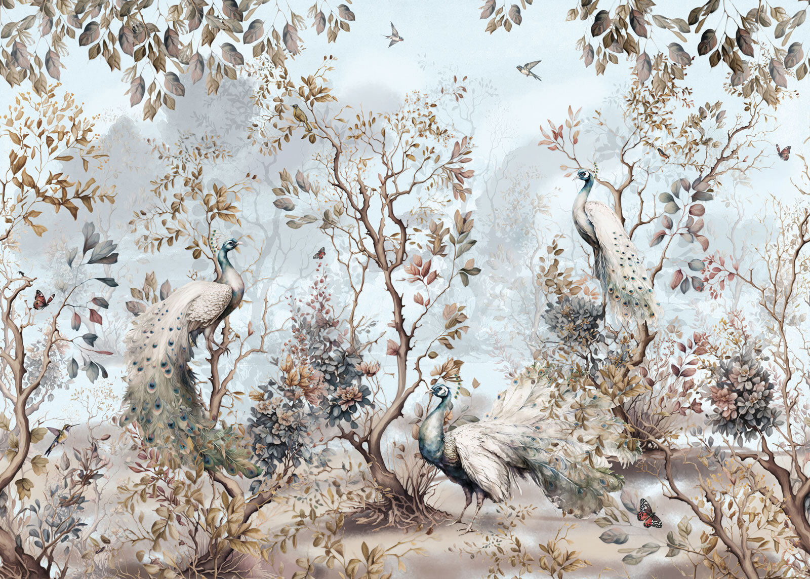Hľadáte spôsob, ako vniesť do interiéru nádych prírodných rozmarov? Freska na stenu “Vták letiaci na oblohe” môže byť presne to, čo váš priestor potrebuje. Predstavte si, že sa zobudíte na tento zasnený výjav elegantných pávov, ktorí sa preháňajú okolo nádherne namaľovaných stromov. Vďaka jemným odtieňom a zložitým detailom sa budete cítiť ako v pokojnom objatí prírody priamo vo vašej obývačke alebo spálni.