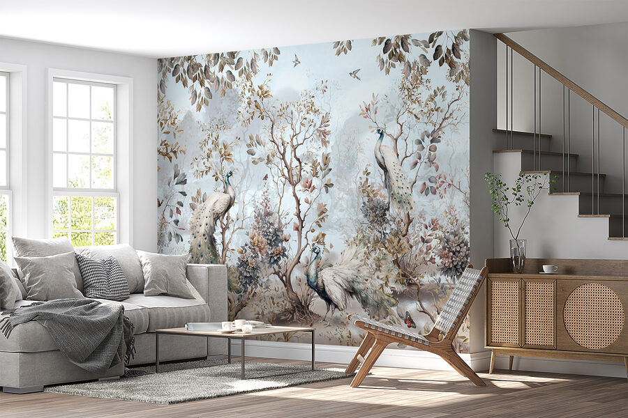 Hľadáte spôsob, ako vniesť do interiéru nádych prírodných rozmarov? Freska na stenu “Vták letiaci na oblohe” môže byť presne to, čo váš priestor potrebuje. Predstavte si, že sa zobudíte na tento zasnený výjav elegantných pávov, ktorí sa preháňajú okolo nádherne namaľovaných stromov. Vďaka jemným odtieňom a zložitým detailom sa budete cítiť ako v pokojnom objatí prírody priamo vo vašej obývačke alebo spálni.