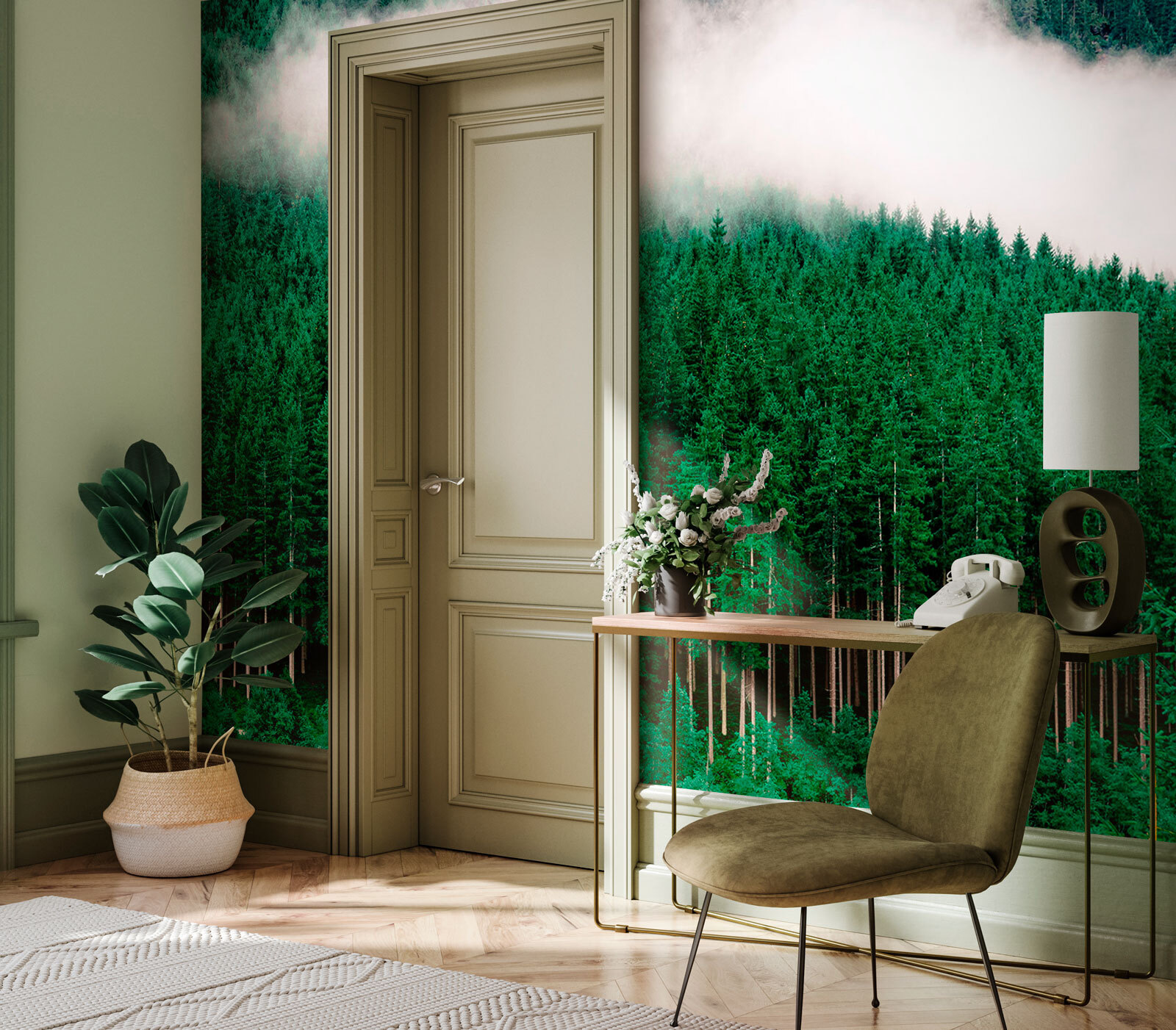 Predstavte si, že sa každý deň zobúdzate s touto úžasnou lesnou scénou priamo na stene! S nástennou maľbou “Skupina stromov v lese” je to ako vstúpiť do pokojného lesa bez toho, aby ste museli opustiť svoj útulný domov. Táto nástenná maľba je viac ako dekorácia – je to únik. Predstavte si rannú kávu s hmlou valiacou sa cez hustý les s vysokými stromami. Je ideálna na dodanie dotyku prírody do každej miestnosti – malý kúsok pokoja a pohody. Hlboká zeleň a textúry vám takmer navodia pocit chladného lesného vánku. Ideálny pre tých, ktorí milujú prírodu, ale nemôžu sa tam vždy dostať. Nie je to len obklad na stenu, je to zážitok. Preneste si lesné kúzlo dovnútra!