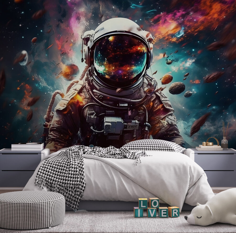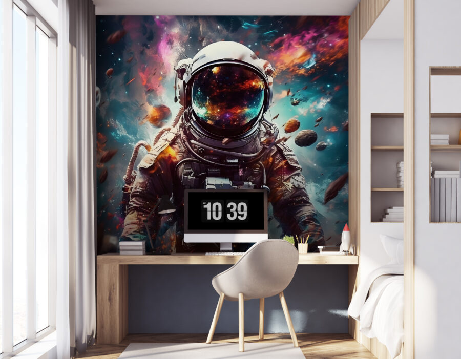 Predstavte si, že máte kúsok vesmíru priamo vo svojej obývačke – alebo ešte lepšie v detskej izbe! Táto nástenná maľba astronauta vznášajúceho sa uprostred vesmírnych trosiek nie je ničím iným ako fascinujúcim. Nie je to len dekorácia, je to dobrodružstvo, ktoré čaká na svoje objavenie. Predstavte si, ako váš malý astronaut hľadí na žiarivé farby a víriace galaxie s očami rozšírenými od úžasu. Je to ako preniesť sa do iného sveta plného tajomstiev a vzrušenia! Je ideálny pre snílkov všetkých vekových kategórií, podnieti predstavivosť a možno aj pár chichotaní o tom, aké vesmírne haraburdy sa tam hore vznášajú. Určite je to podnet na rozhovor a snový únik do každej miestnosti, ktorá potrebuje vesmírny nádych.