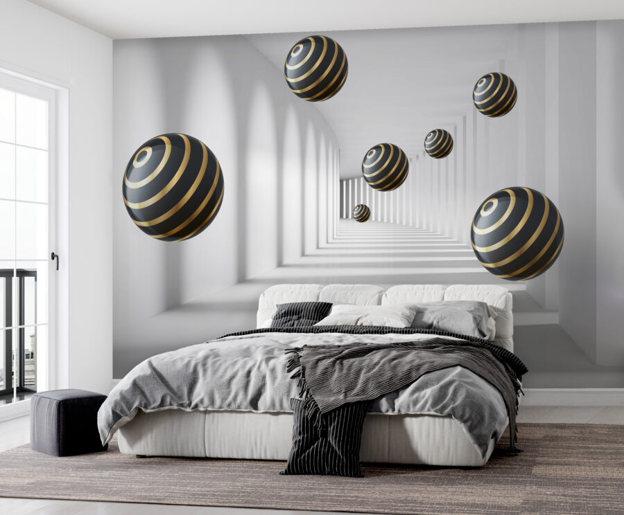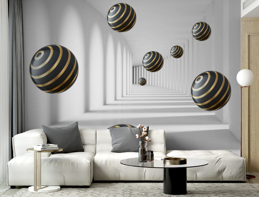 Predstavte si, že vojdete do miestnosti a máte pocit, že ste vstúpili priamo do inej dimenzie. Presne to dokáže nástenná maľba “Pruhované gule vznášajúce sa v bielej chodbe”. Je to tento moderný, takmer hypnotický dizajn, vďaka ktorému sa budete cítiť ako vo futuristickom tuneli. Gule s elegantnými pruhmi sa akoby bez námahy vznášajú a vytvárajú pocit hĺbky, vďaka čomu sa váš priestor môže skutočne zdať väčší. Je to ako mať vlastnú malú kulisu zo sci-fi filmu priamo na stene!
