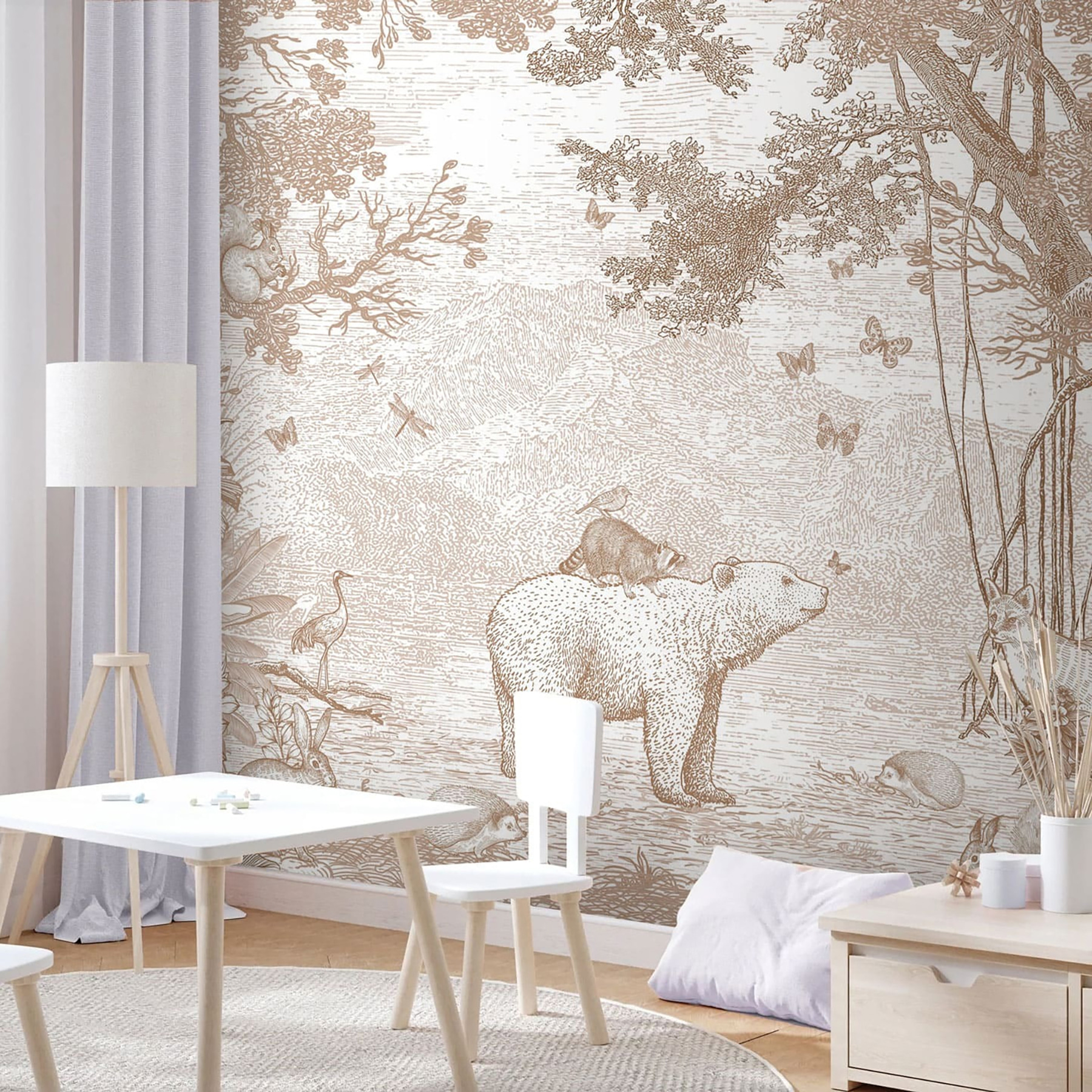 Predstavte si to: pôvabný mýval spokojne sedí na chrbte medveďa, obklopený lesnými priateľmi. Táto nástenná maľba, ktorá je ideálna do každej detskej izby, pôsobí ako stránka priamo z očarujúcej rozprávkovej knihy. Tlmené sépiové tóny jej dodávajú nadčasový charakter, takže pôsobí upokojujúco a príťažlivo – ako jemné objatie pre oči. Vyvolá nekonečné príbehy pred spaním a hravú predstavivosť. Predstavte si, ako sa vášmu dieťatku každý večer rozžiaria oči. Dokonalá kulisa na hranie, čas spánku a všetky útulné chvíle medzi nimi. Podmanivé, rozmarné a také rozkošné!