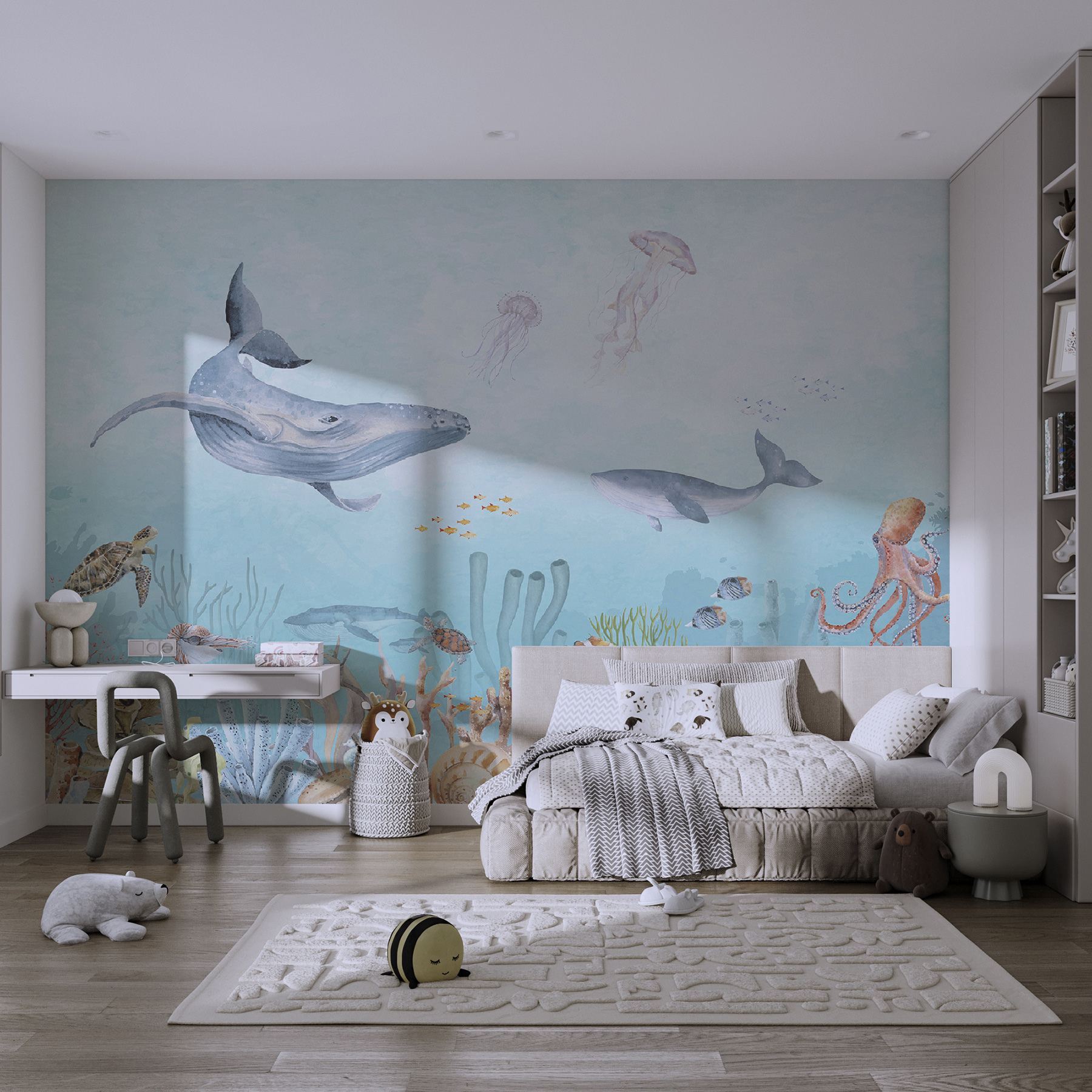 Ponorte sa do mora zázrakov s touto podmanivou nástennou maľbou “Podvodný život”! Predstavte si, že premeníte obyčajnú miestnosť na oceánsky raj plný hravých morských tvorov a žiarivých koralových útesov. Táto nástenná maľba je ideálna na rozvíjanie predstavivosti detí aj dojčiat a prináša kúzlo hlbokej modrej prírody priamo do vášho domova. Je tu obrovská veľryba – a pozrite! Malá skupina klaunov, ktorí sa hrajú na schovávačku v sasankách. Či už sa nachádza v detskej izbe vášho dieťaťa alebo v rozmarnej kúpeľni, okamžite dodá nádych dobrodružstva a pokoja. Nepočujete takmer jemné šumenie vody a jemné špliechanie chápadiel chobotnice? Nainštalujte si ju do svojho priestoru a sledujte, ako sa vám od radosti rozšíria oči (a možno sa aj trochu zachichotáte). Je to viac než len nástenná maľba, je to podmorská eskapáda bez namočenia – tak do toho, špliechajte!