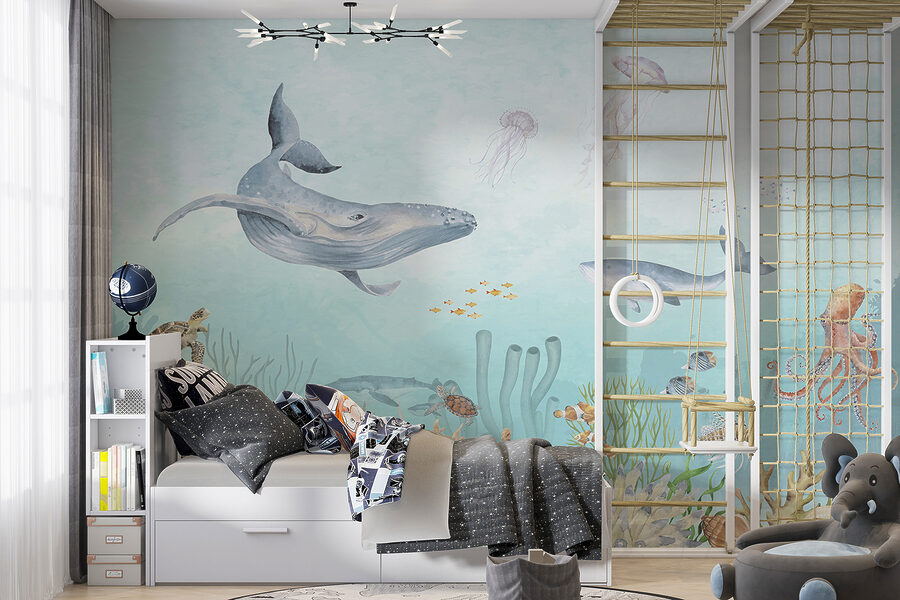 Ponorte sa do mora zázrakov s touto podmanivou nástennou maľbou “Podvodný život”! Predstavte si, že premeníte obyčajnú miestnosť na oceánsky raj plný hravých morských tvorov a žiarivých koralových útesov. Táto nástenná maľba je ideálna na rozvíjanie predstavivosti detí aj dojčiat a prináša kúzlo hlbokej modrej prírody priamo do vášho domova. Je tu obrovská veľryba – a pozrite! Malá skupina klaunov, ktorí sa hrajú na schovávačku v sasankách. Či už sa nachádza v detskej izbe vášho dieťaťa alebo v rozmarnej kúpeľni, okamžite dodá nádych dobrodružstva a pokoja. Nepočujete takmer jemné šumenie vody a jemné špliechanie chápadiel chobotnice? Nainštalujte si ju do svojho priestoru a sledujte, ako sa vám od radosti rozšíria oči (a možno sa aj trochu zachichotáte). Je to viac než len nástenná maľba, je to podmorská eskapáda bez namočenia – tak do toho, špliechajte!