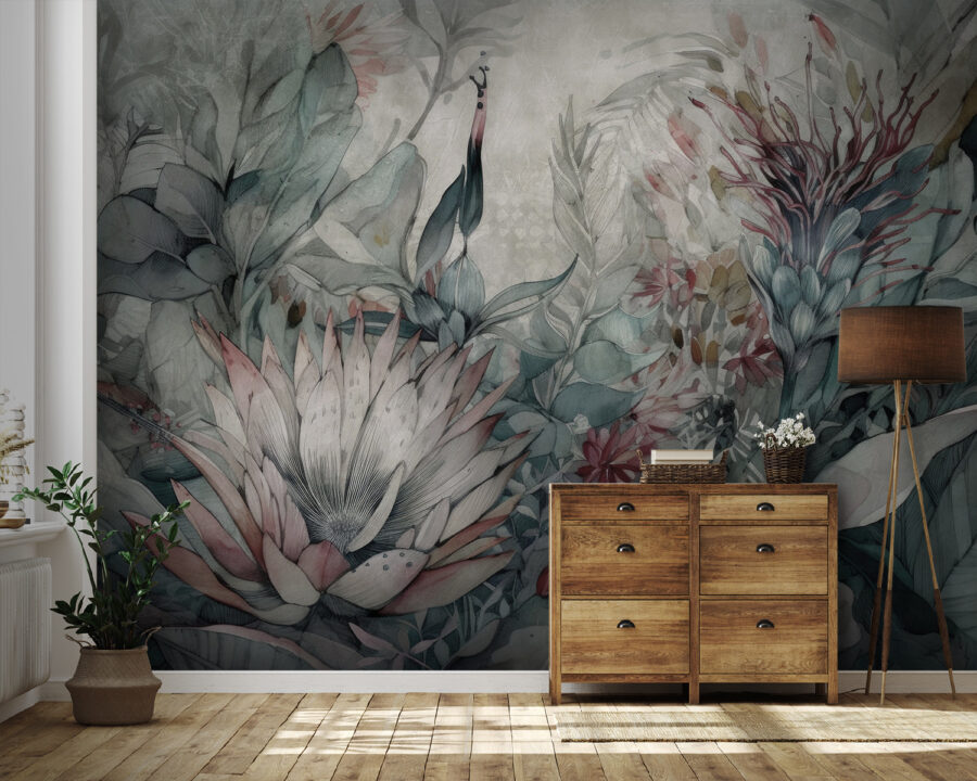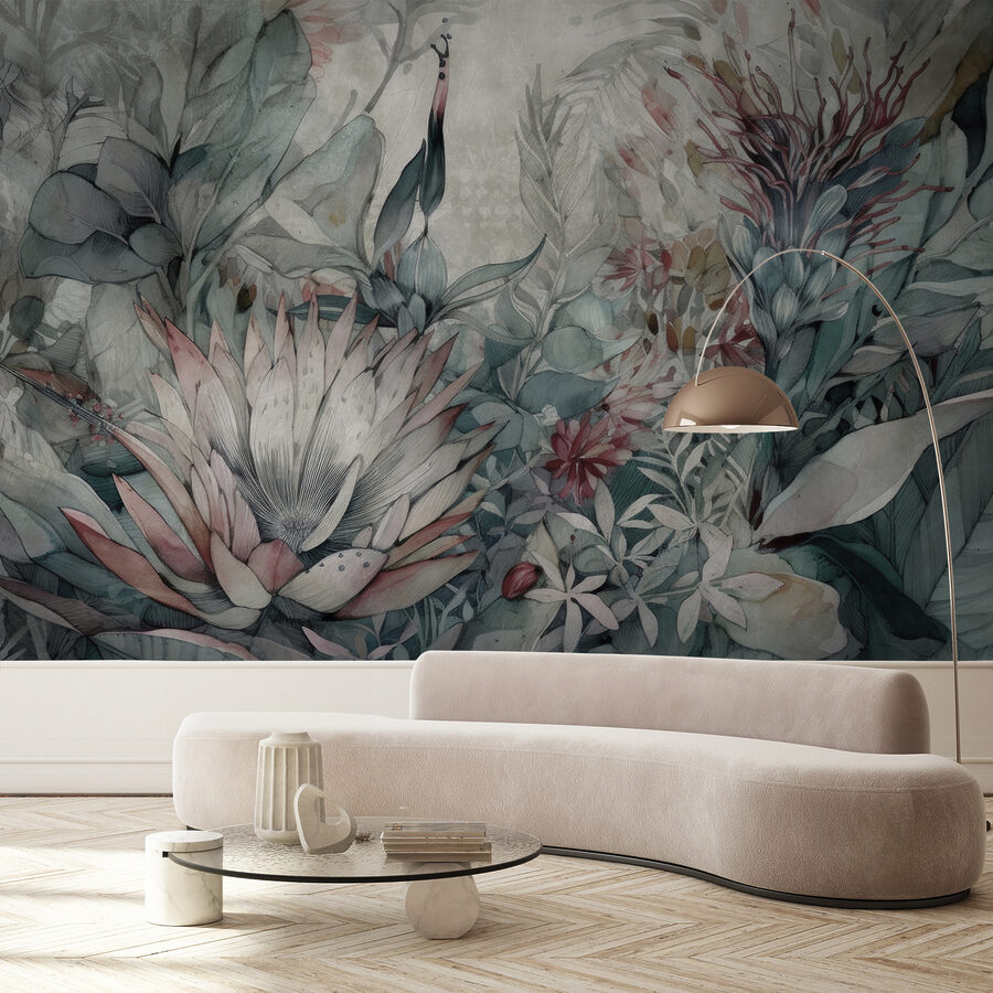 Vstúpte do očarujúceho sna s nástennou maľbou “Jemná kvetinová ilustrácia”. Táto fototapeta je ideálna pre každého, kto miluje nádych rozmarnosti vo svojom interiéri, a prenesie vás priamo do upokojujúcej záhrady v džungli. Predstavte si exotické vtáky a svieže kvety – všetko v jemných, upokojujúcich odtieňoch. Je to ako mať tajný tropický kútik, kde je všetko nežné a pokojné.