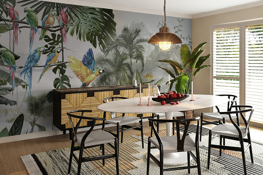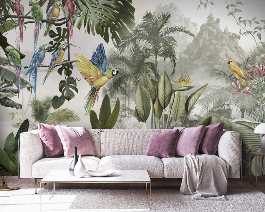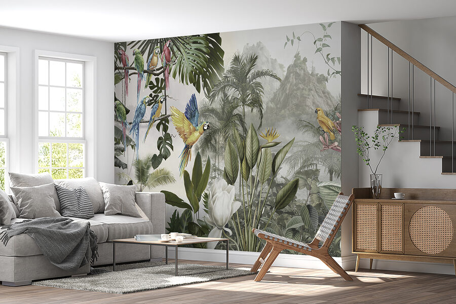 Premeňte akúkoľvek stenu na živú únikovú cestu s touto úžasnou nástennou maľbou farebných papagájov v lete. Predstavte si, že vstúpite do miestnosti, kde títo operení priatelia akoby poletovali priamo vzduchom a každé zakrákanie evokuje pôvab tropického raja. Je to ako preniesť si kúsok prírody do interiéru, bez vlhkosti. Vďaka sviežim listom a žiarivým kvetom je tu cítiť život a vytvára to zasnené pozadie, ktoré vyvoláva radosť a teplo.
