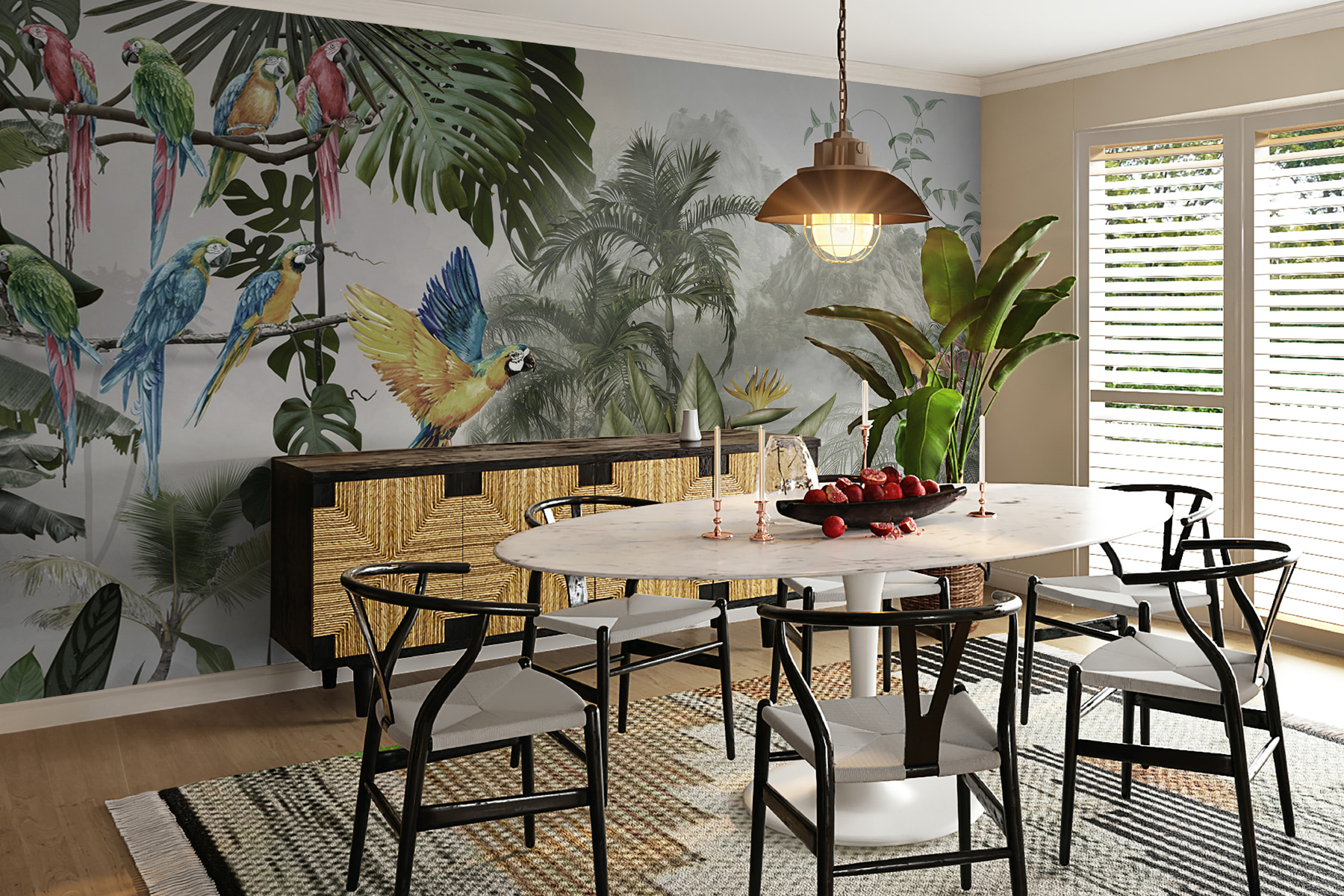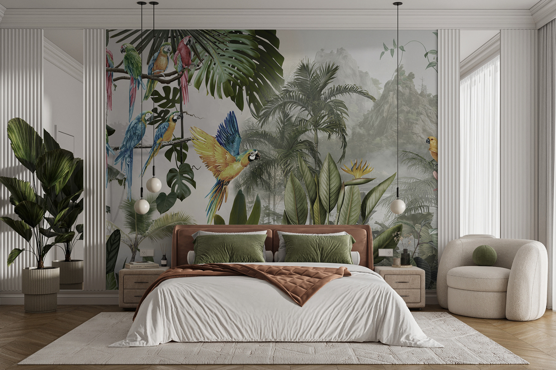 Premeňte akúkoľvek stenu na živú únikovú cestu s touto úžasnou nástennou maľbou farebných papagájov v lete. Predstavte si, že vstúpite do miestnosti, kde títo operení priatelia akoby poletovali priamo vzduchom a každé zakrákanie evokuje pôvab tropického raja. Je to ako preniesť si kúsok prírody do interiéru, bez vlhkosti. Vďaka sviežim listom a žiarivým kvetom je tu cítiť život a vytvára to zasnené pozadie, ktoré vyvoláva radosť a teplo.